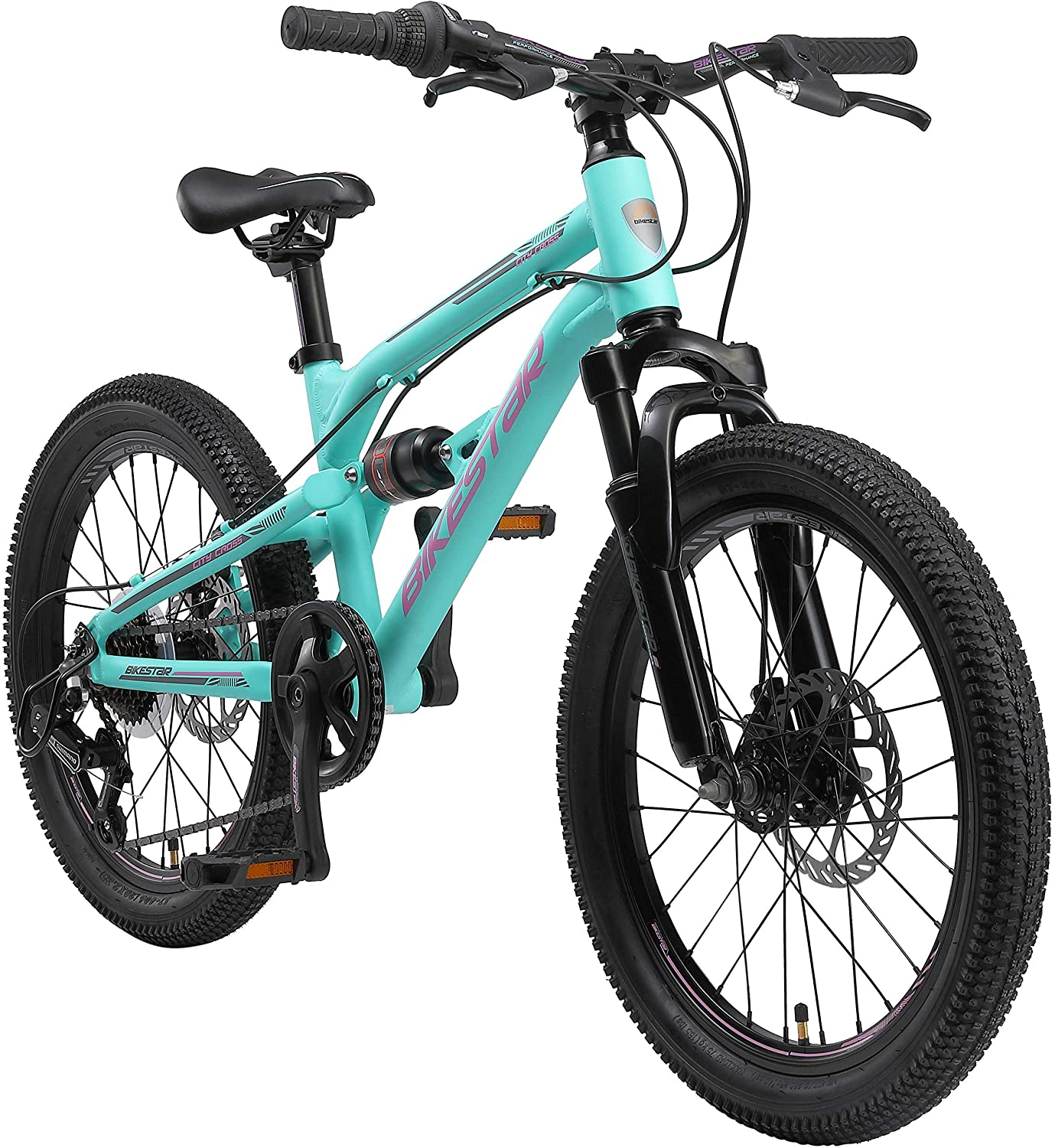 BIKESTAR Mountainbike, 20 Zoll Vollgefedertes MTB mit Scheibenbremsen Das Bikestar Mountainbike besitzt einen stabilen Aluminiumrahmen für den täglichen Einsatz in den Bergen, in der Stadt oder auf dem Weg zur Schule. Mit einer Reifengröße von 20 Zoll und einer Rahmengröße von 12 Zoll ist das Mountainbike für Mädchen und Jungen ab einer Körpergröße von 125 cm geeignet. Dank der 7 Gang Shimano Kettenschaltung mit einer fast nahtlosen Übersetzung bist Du jeder Situation gewachsen und die Scheibenbremsen vorne und hinten sorgen für die nötige Kontrolle bei jeder Geschwindigkeit. Die Federgabel des Mountainbikes bietet in Kombination mit der verbauten Rahmenfederung vollgefederten Komfort und sorgt durch den verbesserten Kontakt zum Boden für mehr Fahrsicherheit & Traktion. Da dieses Fahrrad bereits zu 90% vormontiert zu Dir geliefert wird, geht der Aufbau blitzschnell und kinderleicht. **Technische Daten** - Rahmengröße: 12 Zoll - Gänge: 7 (Shimano) - Rahmenmaterial: 6061 Aluminium - Gabel: Federgabel mit 55mm Federweg - Schalthebel: Shimano Tourney SL-RS25-7R - Schaltwerk: Shimano RD-TY21 - Kette: KMC - Bremsen: Scheibenbremse - Reifen: 20 x 2. 1 Zoll - Gewicht: 11 kg - Max. Belastung (inkl. Zuladung): 50 kg Lieferung erfolgt zu 90% vormontiert Für dieses Produkt gibt es folgende Sicherheitshinweise Achtung: Nicht geeignet für Kinder unter 6 Jahren. Benutzung unter Aufsicht von Erwachsenen Achtung: Mit Schutzausrüstung zu benutzen. Nicht im Straßenverkehr zu verwenden Achtung: Benutzung unter unmittelbarer Aufsicht von Erwachsenen