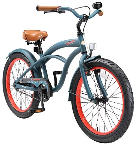 Kinderfahrrad Bikestar 20 Zoll - Deluxe Cruiser SORGENFREIE SPIELFREUDE AB 6 JAHRE Das Kinderfahrrad von Bikestar in der 20 Zoll Ausführung ist für Kinder zwischen 6 und 10 Jahren geeignet. Die Deluxe Edition verfügt über 6 verschiedene Farben. Drei sportliche Räder für Jungen und drei Räder für Mädchen in farbenfrohen Design. Bikestar setzt auf qualitativ hochwertige Waren. Aus diesem Grund verfügt jedes Kinderfahrrad von Bikestar über einen stabilen Stahlrohrrahmen in modernem Design mit schlagfester Mehrschichtlackierung für extra Schutz. Dazu verfügt dass Kinderfahrrad über zahlreiche Sicherheitsfeatures wie die für Kinderfahrräder unerlässliche Rücktrittbremse, die in Gefahrensituationen schnell und einfach bedient werden kann. Natürlich darf auch die handelsübliche Handbremse am Lenker, sowie eine Fahrradklingel und der Kettenschutz nicht fehlen. Die Kinderfahrräder von Bikestar sind mit vielen nützlichen Features ausgestattet, die sowohl den Komfort, als auch die Sicherheit erhöhen. So ist das Bikestar Kinderfahrrad mehrfach und an zwei verschiedenen Stellen höhenverstellbar. Sowohl Lenker, als auch Sattel können in Höhe und Winkel den individuellen Bedürfnissen angepasst werden. Das besondere i-Tüpfelchen der Bikestar Deluxe Edition ist der unverwechselbare Cruiser Look mit angenehmen abgerundeten Gestelldesign. Auch die extra dicken Cruiser-Weisswand-Luftreifen mit lackierten Alufelgen passen perfekt ins Bild und unterstützen den modernen Cruiser Look. FAHRRAD DETAILS HÖHENVERSTELLBARER SATTEL Der ergonomisch geformte Kindersattel sorgt für den nötigen Komfort. Dies ist besonders wichtig, schließlich entscheidet unter anderem der Sattel darüber, wie bequem wir es auf den Fahrrad haben. Mit einem guten Sattel sind auch ausgedehnte Radtouren zusammen mit der Familie kein Problem. Der Bikestar Kindersattel kann für optimalen Komfort und eine perfekte Körperhaltung sowohl in der Höhe, als auch im Neigungswinkel individuell eingestellt werden. Denn auch die Körperhaltung ist ein wichtiges Thema und entscheidet darüber, wie lange wir es auf dem Rad aushalten, bevor eventuelle Rückenschmerzen, aufgrund einer schlechten Haltung auftreten. Besonders in unseren ersten Jahren sind die Knochen noch sehr weich und anfällig für Fehlhaltungen. Dem können Sie mit einer optimalen Satteleinstellung entgegenwirken. REFLEKTOREN Auch in puncto Sichtbarkeit setzt Bikestar Maßstäbe. Obwohl es laut Straßenverkehrsamt keine Sicherheitsansprüche für Kinderfahrräder für den Straßenverkehr gibt, besitzt jedes Kinderfahrrad von Bikestar einen vorderen weißen und hinteren roten Reflektor. Sogar die Pedale sind mit gelben Reflektoren ausgestattet. Die Reflektoren erhöhen die Sichtbarkeit des Fahrrads immens, besonders wenn die Sichtverhältnisse aufgrund von Nebel, Regen oder Dunkelheit eingeschränkt sind. Kleine Kinder sollten zwar nie allein am Straßenverkehr teilnehmen, in der Praxis ist jedoch oft so, dass zumindest kurze Strecken zu Oma oder Opa doch gerne mal mit dem Fahrrad zurückgelegt werden. Auch bei Familienausflügen mit dem Fahrrad sind Reflektoren ein ganz klarer Vorteil, der die Sicherheit erhöht. LENKER Der Lenker des Bikestar Kinderfahrrads kann dank Kugellager besonders einfach bewegt werden. Die daraus resultierende sanfte und leichte Bewegung des Lenkers erhöht den Fahrspaß, indem der Kraftaufwand beim Lenken reduziert wird. Der Lenker kann in Höhe und Neigungswinkel individuell eingestellt werden und ergänzt damit die Einstellungsmöglichkeiten des Sattels perfekt. Der am Lenker befindliche Bremsgriff ist kindgerecht designt und kann dank komfortabler Justagefunktion spielend leicht montiert werden. Die Sicherheitslenkgriffe besitzen einen extra Prallschutz, der im Fall eines Zusammenstoßes die Erschütterungen vermindert und die kleinen Kinderhändchen schützt. Die Lenkgriffe bestehen selbstverständlich aus zertifizierten giftfreien Stoffen und sind damit für die Gesundheit Ihres Kindes in keinster Weise besorgniserregend. BREMSEN Das Bikestar Kinderfahrrad besitzt die bereits erwähnte Felgenbremse am vorderen Lenker. Die hochwertigen Aluminiumfelgen der 20 Zoll Luftreifen sind dank der guten Qualität bestens für die Felgenbremsen geeignet. Weiterhin stattet Bikestar alle Kinderfahrräder mit einer praktischen Rücktrittbremse aus. Die Rücktrittbremse lässt sich, wie der Name bereits erahnen lässt, durch Rückwärtstreten benutzen. Dies ist besonders bei Kinderfahrrädern ein wichtiges Feature, da Kinder in Notsituationen eher dazu tendieren die Pedale in die falsche Richtung zu drücken, als dass sie mit Ihrer Hand die Bremse am Lenker betätigen. KETTENSCHUTZ Da die ersten Fahrversuche auch gerne mal etwas holpriger ausfallen und Fehltritte oder das Abrutschen von den Pedalen dazu gehört, ist ein rundum Kettenschutz für Kinderfahrräder unumgänglich, um unschöne Verletzungen Ihres Kindes und Beschädigungen am Fahrrad zu vermeiden. Der Kettenschutz passt dabei perfekt zum Design des Fahrrads und ist in den entsprechenden Farbtönen gehalten. Auch kleinere Verzierungen, die zum Thema des Fahrrads passen, lassen sich auf dem Kettenschutz finden. Die aus dem Kettenschutz herausragenden Pedale verfügen über ein kugelgelagertes Tretlager. Das erhöht die Langlebigkeit der Pedale und verringert den Widerstand beim Treten. RAHMEN Das Deluxe Kinderfahrrad von Bikestar besitzt einen geschwungengen Rahmen mit verlängerter Gabel. Der komplette Stahlrohrrahmen ist qualitativ zusammengesetzt und besitzt eine Mehrschichtlackierung, die den Rahmen vor Wind und Wetter schützt. Der Rahmen ist in vielen verschiedenen bunten Farben erhältlich und dank des geschwungenen Designs ein echter Augenschmauß, der garantiert für Aufmerksamkeit sorgen wird. Die perfekt aufeinander abgestimmten Farben des Rahmen finden sich auch auf dem Sattel, dem Kettenschutzblech und an den Lenkerfransen wieder. Die coolen Lenkerfransen werten das 