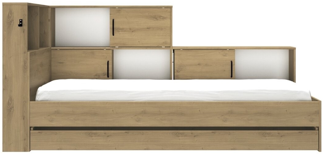 Produktmerkmale: Das ERWAN-Bett vereint Praktikabilität und Ästhetik. Es ist praktisch dank seiner zahlreichen Stauraummöglichkeiten, die es ermöglichen, alle Spielzeuge, Bücher und Gegenstände Ihres Kindes unterzubringen. Dieses Stauraumbett ist so konzipiert, dass es in einer Zimmerecke platziert werden kann. Das Möbelstück ist beim Zusammenbau umkehrbar, um sich an alle Raumkonfigurationen anzupassen. Körper und Fronten bestehen aus mit Papier in Eichenoptik beschichteten Spanplatten, Kanten in derselben Ausführung, von denen einige eingelegt sind. 3 Schiebetüren, 1 Stauraum-Schublade, 1 schwarze Garderobe. Griff aus schwarzem ABS-Draht. Montage links/rechts. Lattenrost und Matratze für Bettwäsche 90x200 cm nicht enthalten. Möbel in Frankreich hergestellt. Liegefläche 90x200. Stauraumschublade über die gesamte Länge der Liegefläche. Große Regale auf 2 Seiten des Bettes, von denen einige mit Schiebetüren ausgestattet sind. Geliefert mit einer Halterung zur Aufbewahrung eines Kopfhörers. Umkehrbarer Stauraum beim Zusammenbau. Produktabmessungen: Länge 221 cm x Breite 120 cm x Höhe 104 cm - Nettogewicht: 76,6 kg. Paketabmessungen: Paket Nr. 1: Länge 70 cm x Höhe 9 cm x Tiefe 114 cm - Bruttogewicht - 28 kg. Paket Nr. 2: Länge 27 cm x Höhe 19 cm x Tiefe 108 cm - Bruttogewicht - 28 kg. Paket Nr. 3: Länge 36 cm x Höhe 7 cm x Tiefe 202 cm - Bruttogewicht - 26 kg. Gesamtbruttogewicht: 82 kg.