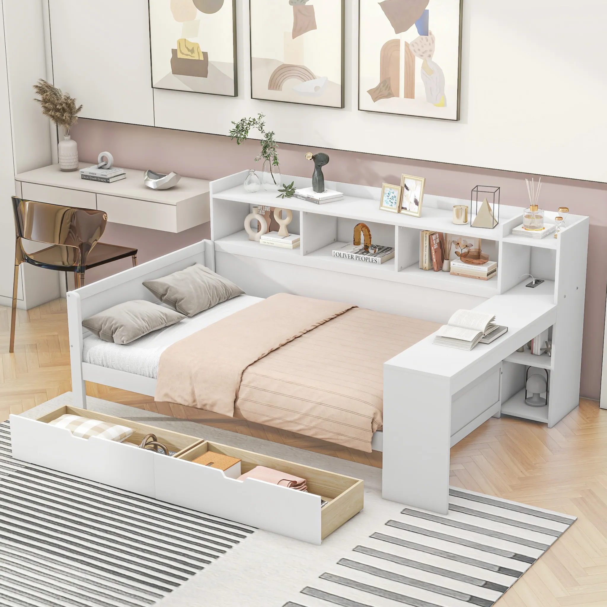 | Name | Jugendbett mit Schreibtisch und Bücherregal, 90x200 cm, Einzelbett mit Schubladen und Mehrfachsteckdose |