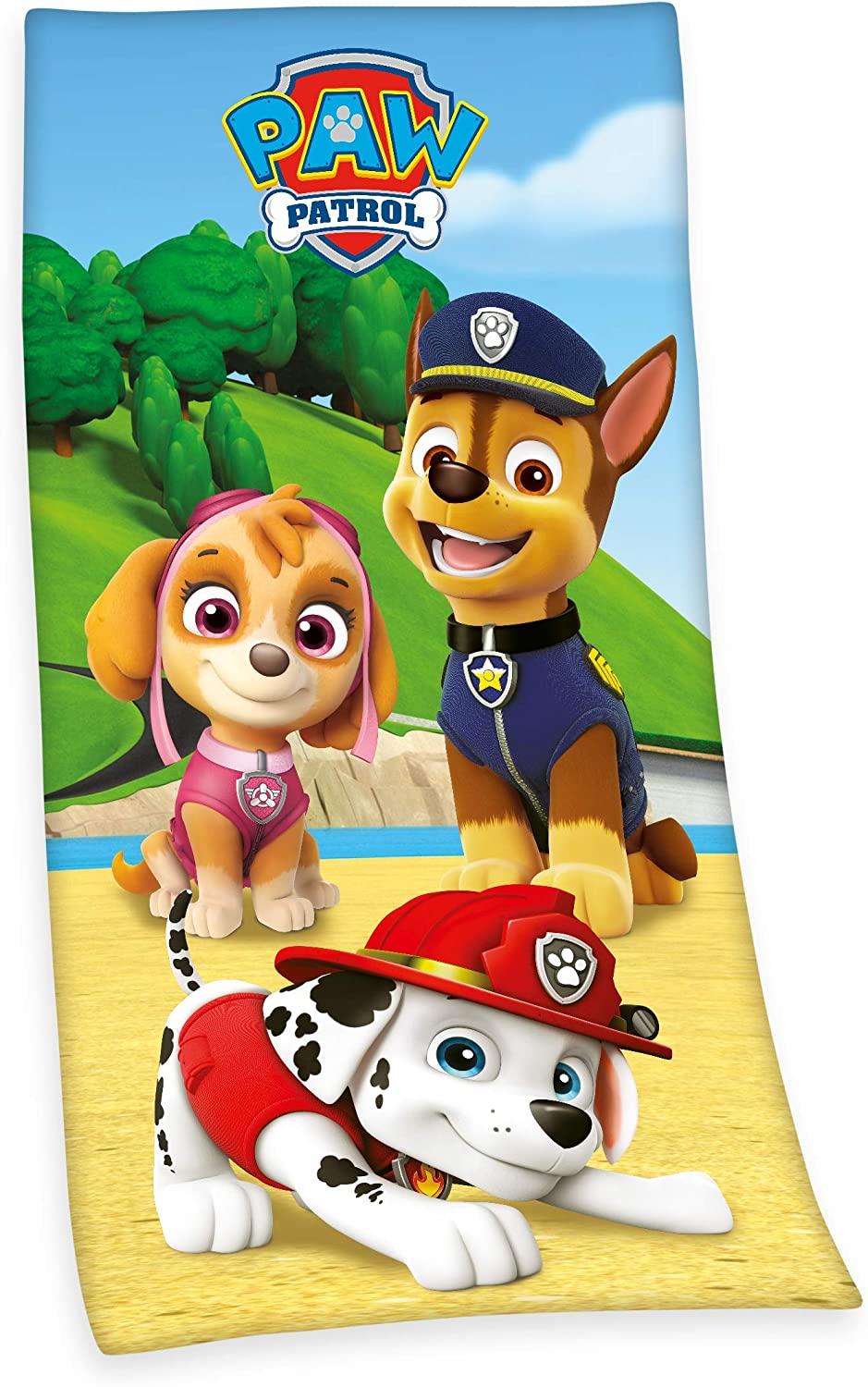 Das Paw Patrol Badetuch in Velours-Qualität ist der perfekte Begleiter für Strand- und Freibadbesuche. Mit einer Größe von 75x150 cm und aus 100 % Baumwolle gefertigt, bietet es kuschelige Weichheit und hohe Saugfähigkeit. Das farbenfrohe Design mit den beliebten Charakteren Chase, Marshall und Skye begeistert kleine Tierfreunde. Das Badetuch ist pflegeleicht, waschbar bei 60 °C und trocknergeeignet, sodass es auch nach mehrmaligem Waschen kräftige Farben behält. **Highlights** - Kuschelig weich auf der Haut - Saugstarkes Material für hohe Feuchtigkeitsaufnahme - Schnelltrocknendes Badetuch - Praktischer Aufhänger für einfache Aufbewahrung - Produziert nach Öko Tex Standard 100 **Produkteigenschaften** - Größe: 75x150 cm - Material: 100 % Baumwolle - Waschbar bei 60 °C - Trocknergeeignet - Kräftige Farben auch nach mehrmaligem Waschen **Lieferumfang** - 1 Herding Badetuch, Paw Patrol - Maße (BxL): 75x150 cm - Farbe: Bunt