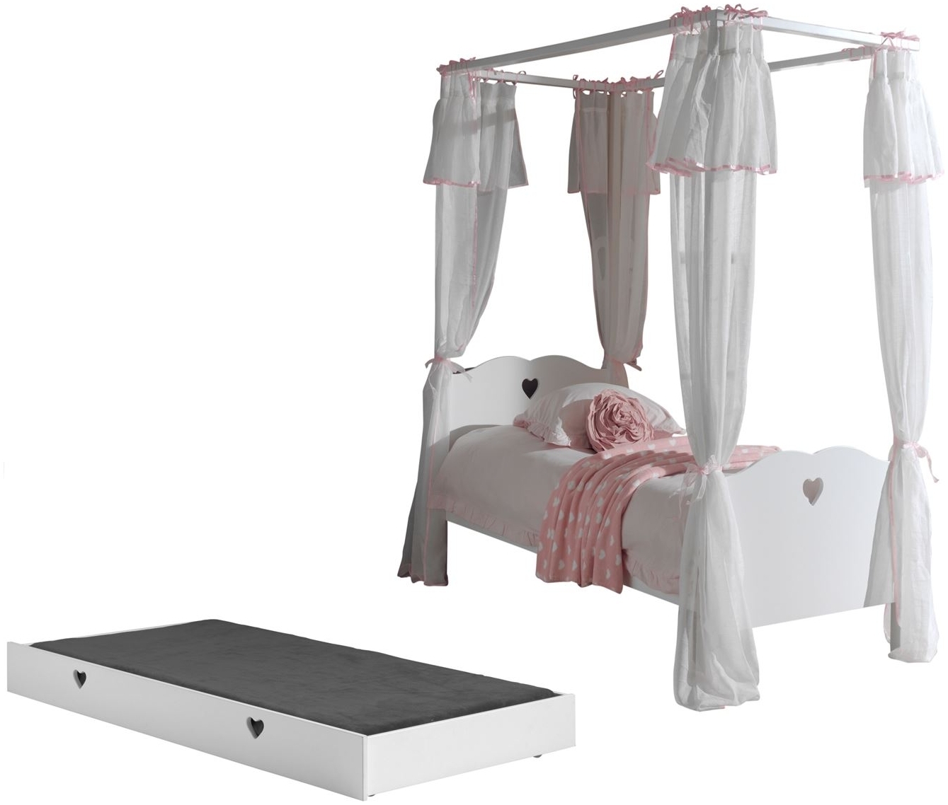 Das Himmelbett Kamila vereint stilvolles Design und Funktionalität. Mit einer Liegefläche von 90x200 cm und einer stabilen Konstruktion aus hochwertigem, weiß lackiertem MDF bietet es nicht nur einen gemütlichen Schlafplatz, sondern auch zusätzlichen Stauraum durch die integrierte Bettschublade. Die herzförmigen Ausschnitte und das Himmelgestänge verleihen dem Bett eine besondere Note. Die Montage erfolgt einfach und schnell mit der beiliegenden Anleitung. **Highlights** - Herzförmige Ausschnitte als Detail - Himmelgestänge inklusive - Bettschublade für zusätzlichen Stauraum - Stabiles und hochwertiges Schichtholz-Lattenrost - Pflegeleicht, mit einem feuchten Tuch abwischbar **Produkteigenschaften** - Material: Hochwertiges MDF, weiß lackiert - Maße (B x H x T): 211 x 187 x 96 cm - Liegefläche: 90x200 cm - Einlegetiefe für Matratze: ca. 7 cm - Anzahl der Federleisten: 17 (aus Birke) - Innenmaß der Bettschublade: ca. 90 x 12,5 x 190 cm - Außenmaß der Bettschublade: ca. 199 x 15 x 94 cm - Farbe der Textilschals: Uni Weiß mit rosa Absatz - Material der Textilschals: 100% Polyester, bei 40° waschbar **Lieferumfang** - Himmelbett - Himmelgestänge - 4 Textilschals (jeweils B: 105 x H: 200 cm) - Bettschublade - Aufbauanleitung Dekoration und Matratze sind nicht im Lieferumfang enthalten.