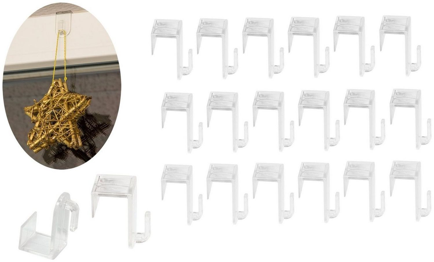 | Name | BigDean 24er Set Fenster- und Türhaken - Aus transparentem Kunststoff - Unauffällig & Effizient - Für ein Fensterfalz von max. 1,7 cm - Ideal für Lichterketten, Dekoanhänger & Weihnachts-Deko - |