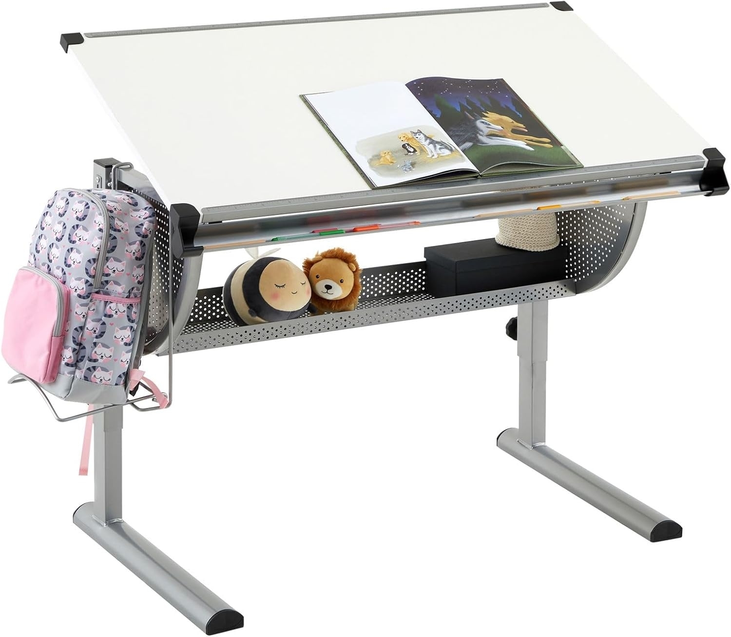 ## Unser höhen- und neigungsverstellbarer Kinderschreibtisch MADS bringt Kinderaugen zum Leuchten. Der Schreibtisch fördert dank der höhen- und neigungsverstellbaren Tischplatte eine ergonomische Körperhaltung des Kindes. Dadurch verringert sich das Risiko von Haltungsschäden oder Rückenschmerzen und das Lernen, Basteln und Lesen macht mehr Spaß. Für Schulbücher und Lernmaterial bietet die große Arbeitsplatte und die darunter liegende, geräumige Ablage viel Platz. ### Materialbeschreibung: * Der Schülerschreibtisch ist mit einem alufarbig lackierten Metallgestell als auch mit einer melaminbeschichteten und weiß lackierten Arbeitsplatte ausgestattet. ### Ausstattung / Merkmale des Produkts: * in 3 cm Abständen höhenverstellbar von 63 bis 93 cm * in 9 Stufen neigungsverstellbar von 0° bis 42° * abwischbare und kratzfeste Tischplatte * Bücher- und Ablagekorb unterhalb der Schreibtischplatte * praktische Schale für Stifte und Schreibmaterialien * abnehmbare, links oder rechts montierbare Schultaschenhalterung ### Versand &, Montage: * Lieferumfang: Kinderschreibtisch inkl. Aufbauanleitung * Artikel wird zerlegt geliefert * Kundenfreundliche Montage mit Hilfe der beigelegten Aufbauanleitung * Lieferung erfolgt per Paketdienst * Lieferung erfolgt ohne Dekoration **Zusammenfassung:** - Farbe: weiß/alu - Material: Spanplatte - Material Gestell: Metall - Aufbaumaße: 111 x 90 x 60 cm (B x H x T) - Höhenverstellbar: Ja - Neigungsverstellbar: Ja - Oberfläche: Lackiert - Höhe (max.): 93 cm - Höhe (min.): 63 cm - Neigungsstufen (Anzahl): 9 - Neigungswinkel (max.): 42 ° - Neigungswinkel (min.): 0 °