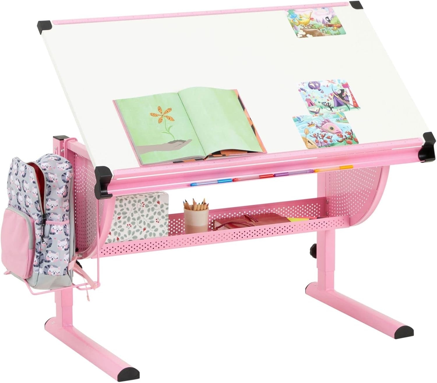 Der Kinderschreibtisch Sari bietet Ihrem Kind einen ergonomischen Arbeitsplatz, der sich in Höhe und Neigung anpassen lässt. Mit einer Mindesthöhe von 62 cm ist er bereits ab dem Vorschulalter nutzbar. Die neigungsverstellbare Tischplatte mit 9 Stufen und einem maximalen Neigungswinkel von 42° fördert eine gesunde Körperhaltung. Eine praktische Rille auf der Arbeitsfläche verhindert das Herunterrollen von Stiften. Zudem sorgt eine seitliche Ablage für Ordnung. **Highlights** - Höhenverstellbar von 62 cm bis 93 cm - Neigungsverstellbare Tischplatte mit 9 Stufen - Maximaler Neigungswinkel von 42° - Praktische Rille zur Stiftablage - Seitliche Ablage für Schulranzen und Zubehör **Produkteigenschaften** - Aufbaumaße: 111 x 93 x 60 cm (B x H x T) - Tischplatte aus MDF in der Farbe Weiß - Gestell aus Metall, Farbe: Rosa - Oberfläche: Lackiert **Lieferumfang** - Kinderschreibtisch Sari inkl. Rucksackhalterung - Kundenfreundliche Montageanleitung - Lieferung erfolgt ohne Dekoration