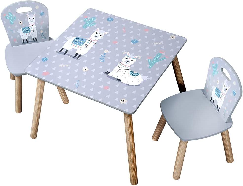 Produktdetails: Kinder-Sitzgruppe: 1 Tisch, 2 Stühle Maße Stühle: BHT 27 x 53 x 27cm Material: Faserplatte Farbe: farbig lackiert, bedruckt mit Alpaka-Motiv (Tisch- und Stuhlbeine mit Holzdekorfolie) ca. Maße Tisch: Breite: 55cm Höhe: 45cm Tiefe: 55cm Lieferumfang: 1x Kindertisch mit 2 Stühlen - Alpaka-Motiv Eventuell vorhandene Dekorationsartikel sind nicht im Lieferumfang enthalten.