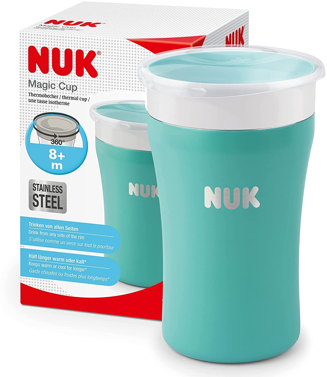 | Name | NUK Magic Cup Trinklernbecher aus Edelstahl | ab 8 Monaten | 230 ml | auslaufsicherer 360°-Trinkrand | auslaufsicher | BPA-frei und auswaschbar | Blau |