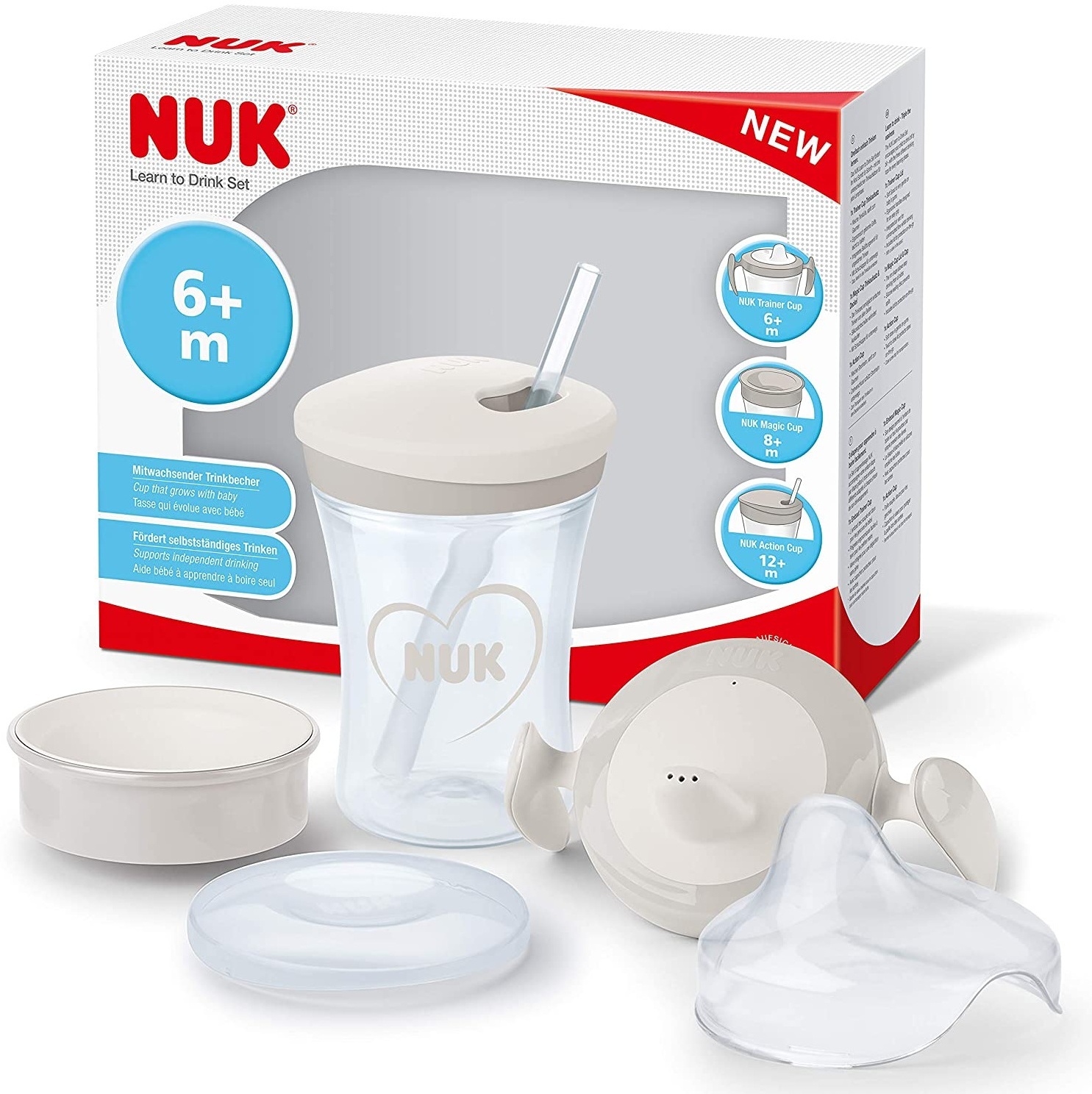 | Name | NUK 3-in-1 Trinklernset mit Trainer Cup Schnabeltasse (6+ Monate), Magic Cup 360° Trinklernbecher (8+ M) & Action Cup Trinklernflasche (12+ M) | 230 ml | BPA-frei | Herz (neutral) |