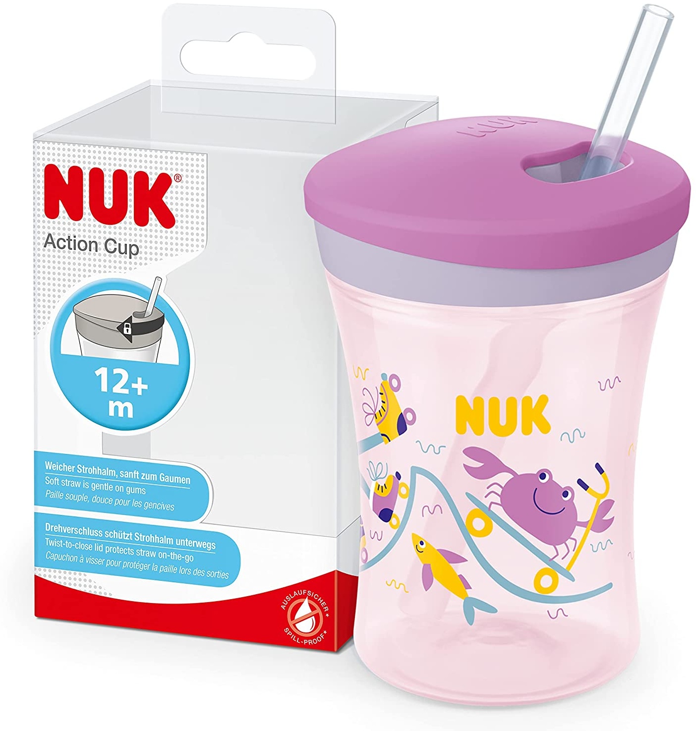 | Name | NUK Action Cup Trinkbecher Kinder | 12+ Monate | 230 ml | Drehdeckel mit weichem Strohhalm | auslaufsicher | BPA-frei | lila Krabbe |