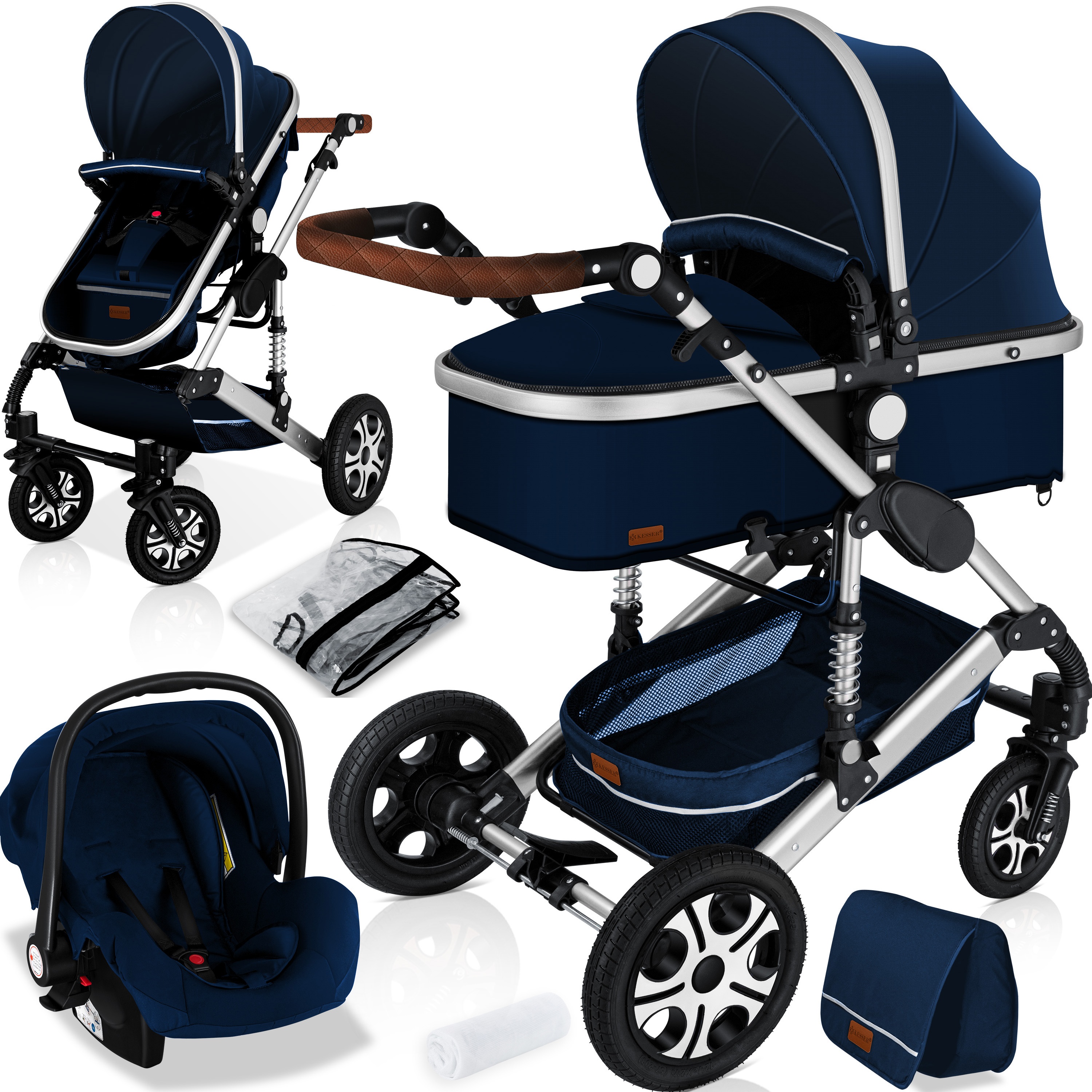 | Name | KESSER® 'Loops' Kombikinderwagen 3 in 1 Kinderwagen inkl. Babywanne, Buggy Sportsitz, Auto-Babyschale - Voll-Gummireifen - Wickeltasche/Regenschutz Blau / Silber |