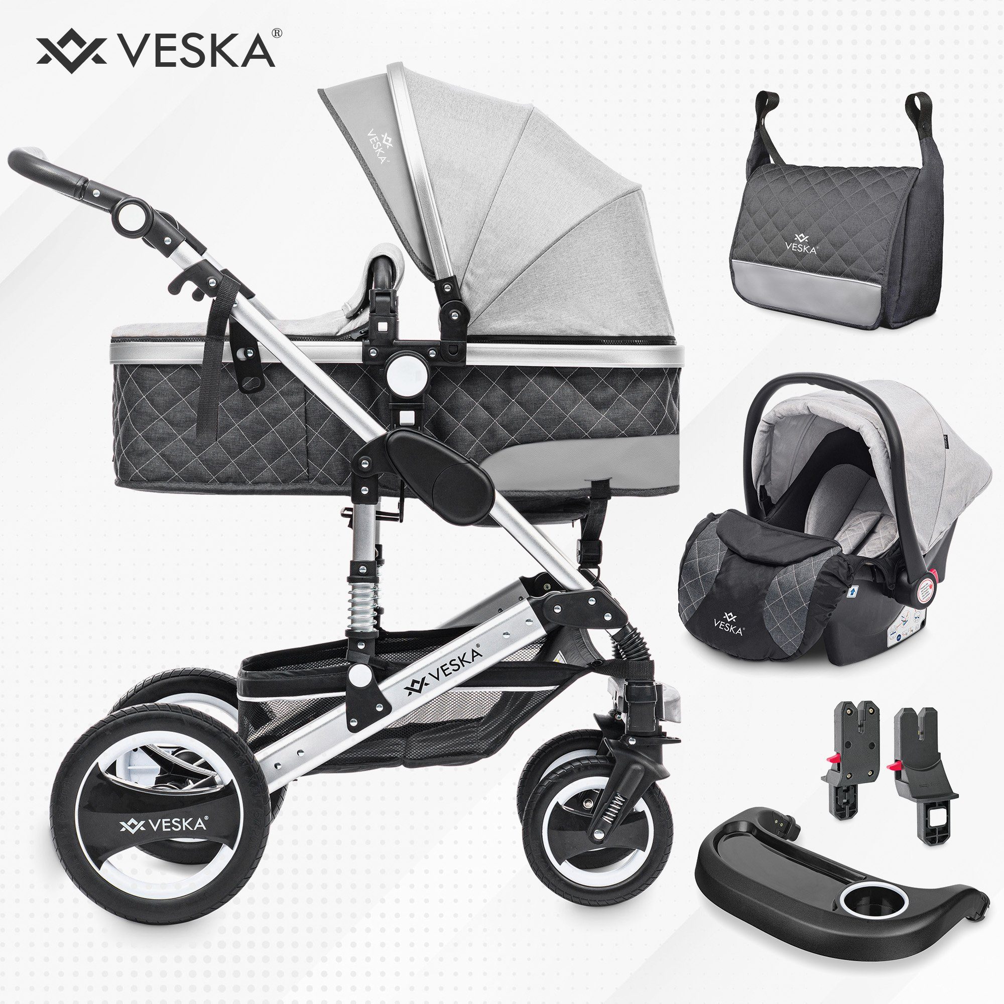 | Name | VESKA 3 in 1 Kombi-Kinderwagen inkl. Babyschale, Buggy, Jogger mit Wickeltasche, Moskitonetz, Regencover, Spieltisch, Autoschale Fußsack, QuickFold, Aluminiumrahmen (Silber - anthrazit/grau) |