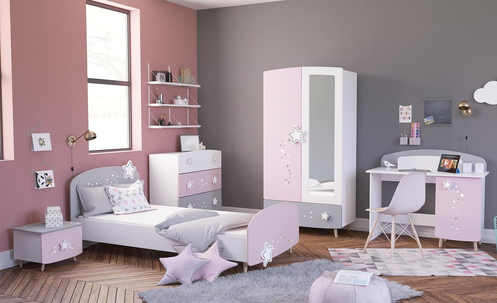 Das Jugendzimmer-Set "Savannah" (5-teilig) in Weiß verwandelt jedes Mädchenzimmer in ein märchenhaftes Reich. Es besteht aus einem bequemen Bett, einem Kleiderschrank, einer Schubladenkommode, einem Schreibtisch und einem Nachttisch. Gefertigt aus Spanplatte und mitteldichter Holzfaserplatte, bietet es eine robuste und langlebige Lösung für die Einrichtung. Die harmonische Farbkombination aus mattem Weiß, Rosa und Grau sowie liebevolle Details wie sternförmige Griffe machen das Set besonders ansprechend. **Highlights** - Bequemes Bett für friedlichen Schlaf - Robuste Verarbeitung für langlebigen Einsatz - Farbkombination in mattem Weiß, Rosa und Grau - Liebevolle Details mit Sternmotiven - Einfache Montage dank bebilderter Anleitung **Produkteigenschaften** - Kleiderschrank: Breite 95 cm, Höhe 186,6 cm, Tiefe 51,6 cm - Schubladenkommode: Breite 87 cm, Höhe 86,5 cm, Tiefe 41 cm - Schreibtisch: Breite 113,2 cm, Höhe 94,5 cm, Tiefe 50 cm - Bett: Breite 97 cm, Höhe 77 cm, Tiefe 204,5 cm - Nachttisch: Breite 44,4 cm, Höhe 33,7 cm, Tiefe 33,8 cm - Material: Korpus aus Spanplatte, Front aus mitteldichter Holzfaserplatte, Füße aus Naturholz, Spiegelglas - Plattenstärke: 15 mm - Nicht für Kinder unter 6 Jahren geeignet **Lieferumfang** - 1x Kleiderschrank - 1x Schubladenkommode - 1x Schreibtisch - 1x Bett - 1x Nachttisch - Lieferung erfolgt zerlegt inkl. Aufbauanleitung - Verkauf ohne Matratze, Lattenrost, Dekoration und Beimöbel