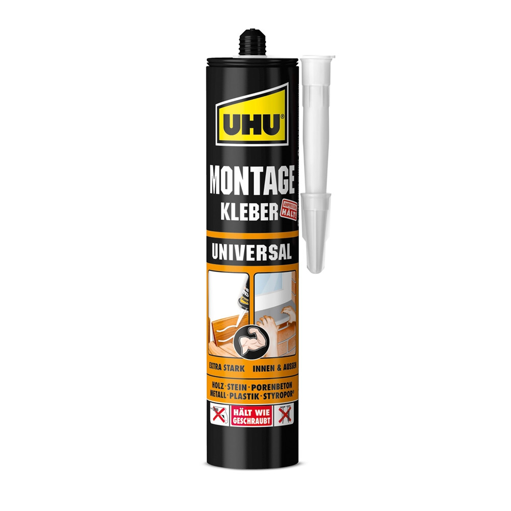 Der UHU Montagekleber Universal ist eine gute Alternative zum herkömmlichen Nageln von Gegenständen. Mit diesem Kleber können Sockelleisten, Übergangsleisten und andere Objekte bombenfest an der Wand befestigt werden. Auch bei nicht ganz geraden Wänden bietet dieser Montagekleber einen sicheren Halt. Besonders überzeugend ist das Preis-Leistungs-Verhältnis des Produkts.