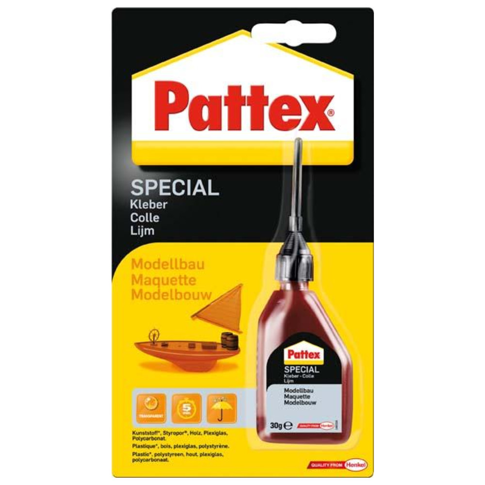 Der Henkel Pattex Modellbau Plastic Kleber ist ein dünnflüssiger Spezialkleber, der sich besonders für filigrane Teile eignet. Nach dem Aushärten hält er fest und hinterlässt keine Rückstände. Ein großer Vorteil dieses Klebers ist seine Möglichkeit zur Korrektur während der Trocknungszeit sowie die Verwendung bei abgerissenen Teilen.