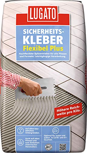 • Der Lugato Sicherheitskleber Flexibel Ultra Plus 18 kg entspricht der C2TE-Qualität der EN 12004 und der S1-Qualität der EN 12002.