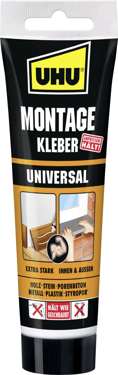 Der UHU Montagekleber Universal wird von den Kunden als sehr effektiv und stark empfunden. Er hält das Material bombenfest, sodass es nicht mehr gelöst werden kann. Auch für schwierige Untergründe wie Beton oder widerspenstige Wände ist er geeignet.