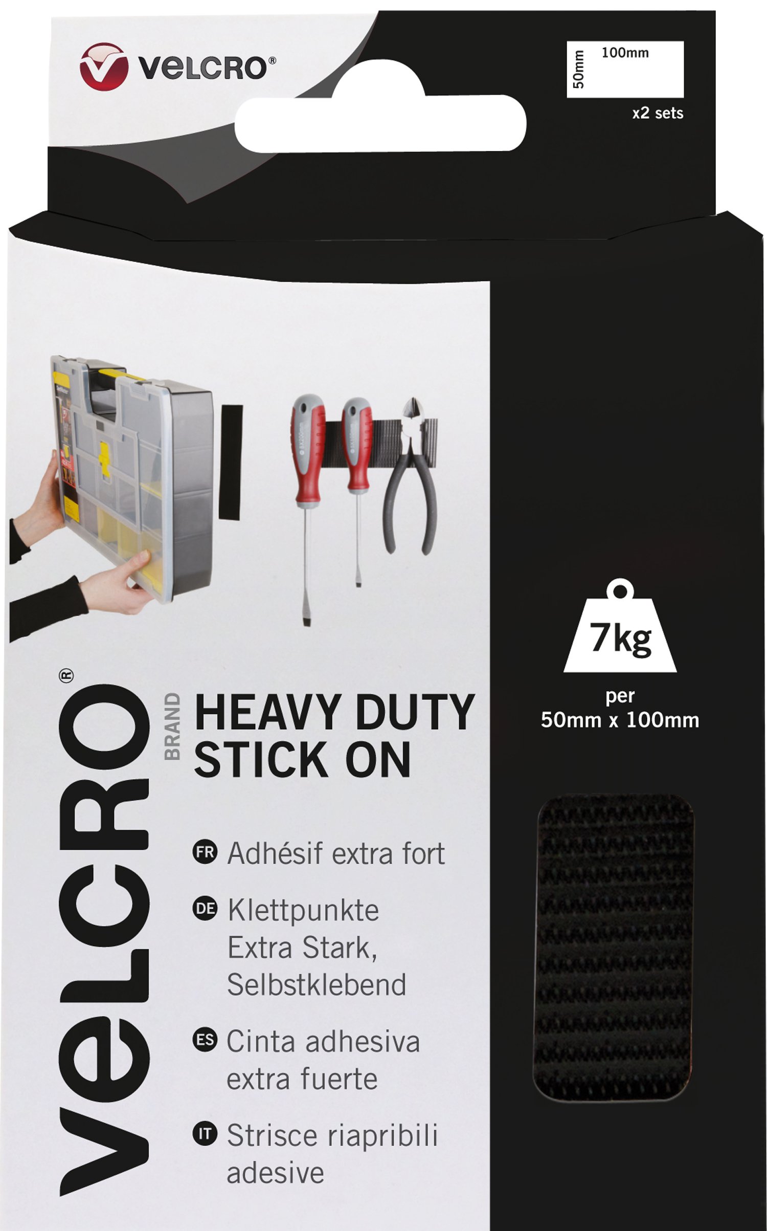 Das VELCRO 2 sets Heavy Duty Stick on Strips 50mm x 100mm schwarz bietet eine zuverlässige Möglichkeit, Gegenstände an Ort und Stelle zu halten. Es ist einfach zu verwenden und hat eine starke Klebekraft, die dafür sorgt, dass Ihre Gegenstände sicher befestigt bleiben.