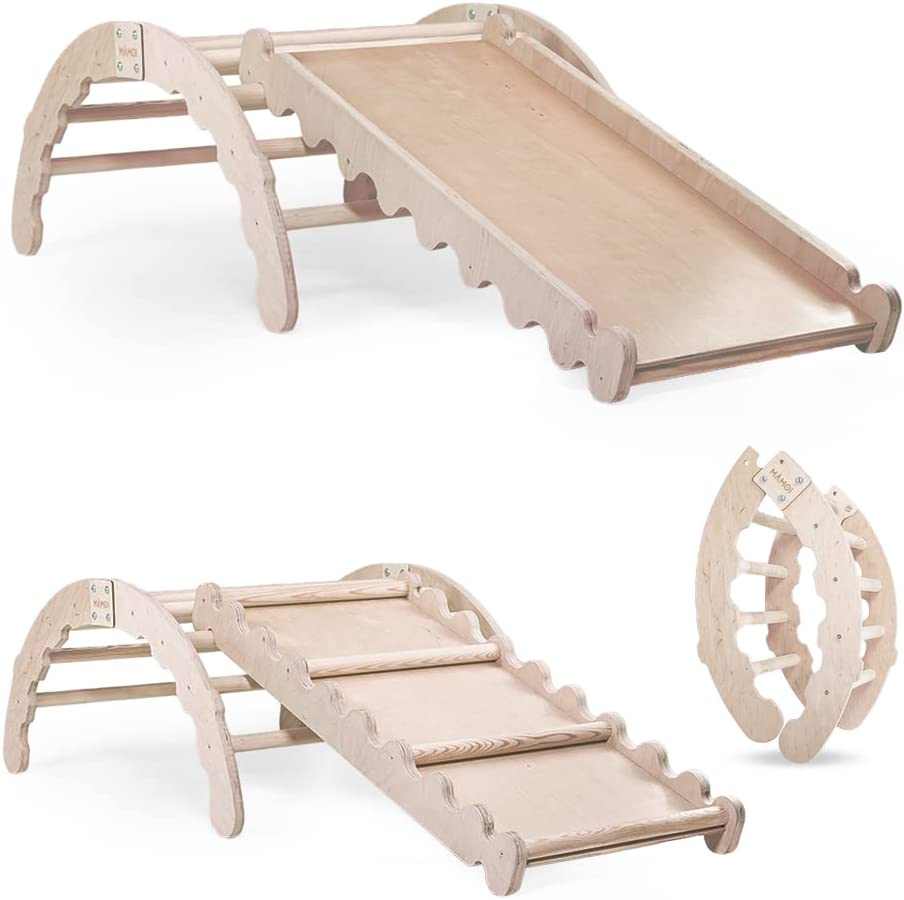 ✔ Das Kletterdreieck für Kleinkinder garantiert sicheres Spielen zu Hause und im Garten. Das Produkt erfüllt die strengen Sicherheitsanforderungen und EN UND CE NORMEN. Das indoor Klettergerüst Kinder ist aus hochwertigem Kiefern- und Sperrholz gefertigt. Die Elemente sind mit Stahlschrauben verbunden. Nach dem Entfernen der Schrauben kann das Dreieck zusammengeklappt werden. Der Kletterturm Indoor ist sehr langlebig und kann nicht nur als Wippe, sondern auch als Leiter verwendet werden. ✔ Das Produkt wurde aus umweltfreundlichen Materialien wie Naturholz und Sperrholz hergestellt, die durch ökologische und für Kinder sichere Mittel geschützt sind. Bei der Herstellung wurden keine schädlichen Farben oder Lacke verwendet. Die Bestandteile der Wippe Holz sind von einzigartiger Schönheit und im rohen Holzdesign. Diese Elemente werden auch sorgfältig geschliffen und CNC-geschnitten. ✔ Das Kletterdreieck mit Rutsche ist - je nach Gewicht und Größe (bis 60 kg) - für Kinder über 36 Monate geeignet. und eignet sich perfekt zum Spielen zu Hause sowie im Garten. Der Kletterturm Indoor ist ein multifunktionales Spielzeug und Es kann sowohl als Kletterleiter, als auch als eine Wiege dienen. Das indoor Klettergerüst Kinder ist bereit zur Selbstmontage. ✔ Einfaches und modernes Design des Indoor Klettergerüst passt in jedes Kinderzimmer. Die Wippe Kinder Outdoor und Indoor hat die Form eines Bogens. Zur Wiege kann man auch bunte Kissen und Decken hinzufügen. Der Kletterbogen mit Rutsche ist aus CNC-geschnittenem Kiefernholz sowie hochwertigem Sperrholz gefertigt. Eine Seite der Holzrutsche ist glatt, auf der anderen Seite gibt es verstärkende Sprossen. ✔ MAMOI-Garantie - 100% Geld-zurück-Garantie. Bei MAMOI ist höchste Qualität nicht nur mit den Produkten verbunden, sondern auch mit unserem Kundenservice: Wenn Sie sich nicht in unser Produkt verlieben, erstatten wir Ihnen Ihr Geld zurück. Das Kletterdreieck für Kleinkinder ist ein Produkt, das speziell für die Kleinsten entwickelt wurde, um ihre psychomotorische Entwicklung zu fördern. Die Firma MAMOI setzt auf ökologische Materialien sowie hochwertige Verarbeitung. Das garantiert, dass nur die besten Produkte, die den strengen europäischen Normen entsprechen, an den Kunden geliefert werden. 2 in 1 - Spielzeug: Je nach Einstellung kann das Produkt ein Kletter Dreieck oder eine Holzwippe sien. Wenn man das Produkt nach oben lenkt, erhält man ein Klettergerüst Indoor. Drehen Sie das Spielzeug, können Sie es als Schaukelwippe benutzen. Der Rahmen besteht aus natürlichem Kiefernholz und Sperrholz. Im Set finden Sie auch eine Indoor Rutsche Holz, die leicht abgenommen oder schnell aufgesetzt werden kann. Die Kinderrutsche ist aus hochwertigem Sperrholz und Holzsprossen gefertigt. Eine Seite ist glatt, auf der anderen befinden sich Sprossen, an denen ein Kind hochklettern kann. Diese wird auf den Sprossen mithilfe von dekorativen Einschnitten angebracht. Die Höhe sowie die Position der Rutsche lassen sich leicht anpassen. Die Rohstoffe sind durch ökologische Mittel geschützt, die umweltfreundlich und sicher für Kinder sind. Alle Bestandteile werden sorgfältig ausgeschnitten (CNC) und nachbearbeitet, so dass sie grat- und splitterfrei sind. Der Kletterbogen auch bekannt als der Pikler oder das Pikler Dreieck mit Rutsche ist von Emmi Pikler, einer weltweit anerkannten Kinderärztin und Therapeutin, inspiriert. Das Klettergerüst indoor ist für Kinder über 36 Monate geeignet. Unser Kletterdreieck mit Rutsche eignet sich perfekt zum Spielen, fördert aber dabei auch die Körpermotorik sowie übt die Fähigkeiten zu Greifen und Klettern. Am Rand ist die Regenbogen Wippe wellenförmig geschnitten. Das indoor Klettergerüst Kinder ist bereit zur Montage. Im Set befindet sich das Triangle Gym Dreieck mit abnehmbarer Indoor Rutsche Holz. Das Produkt kann im Freien verwendet werden, sollte aber an einem trockenen und sauberen Ort gelagert werden. Aufgrund der natürlichen Materialien darf es keinen ungünstigen Wetterbedingungen wie Regen oder Schnee ausgesetzt werden. Der Hersteller ist nicht verantwortlich für die Nichteinhaltung der Lagerbedingungen der Spielzeuganleitung. Warnhinweise Verwendung unter direkter Aufsicht von Erwachsenen. Alle unsere Produkte sind entworfen und in der Europäischen Union hergestellt: Das Geheimnis der Langlebigkeit unserer Spielzeuge ist eigentlich sehr einfach - alle unsere Produkte sind aus hochwertigen Materialien hergestellt, darunter Holz, Baumwolle und Metall, dank denen die Spielzeuge langlebig und widerstandsfähig gegen Beschädigungen sind. Wir sorgen uns um die Zufriedenheit unserer Kunden, deshalb vermeiden wir billige Kunststoffe und unnötige Spielzeugelemente, die schnell abfallen oder kaputt gehen können, was für das Kind gefährlich sein könnte. Sehen Sie sich unser Angebot an und probieren Sie unsere Spielzeuge aus - wir versprechen, Sie werden es nicht bereuen!