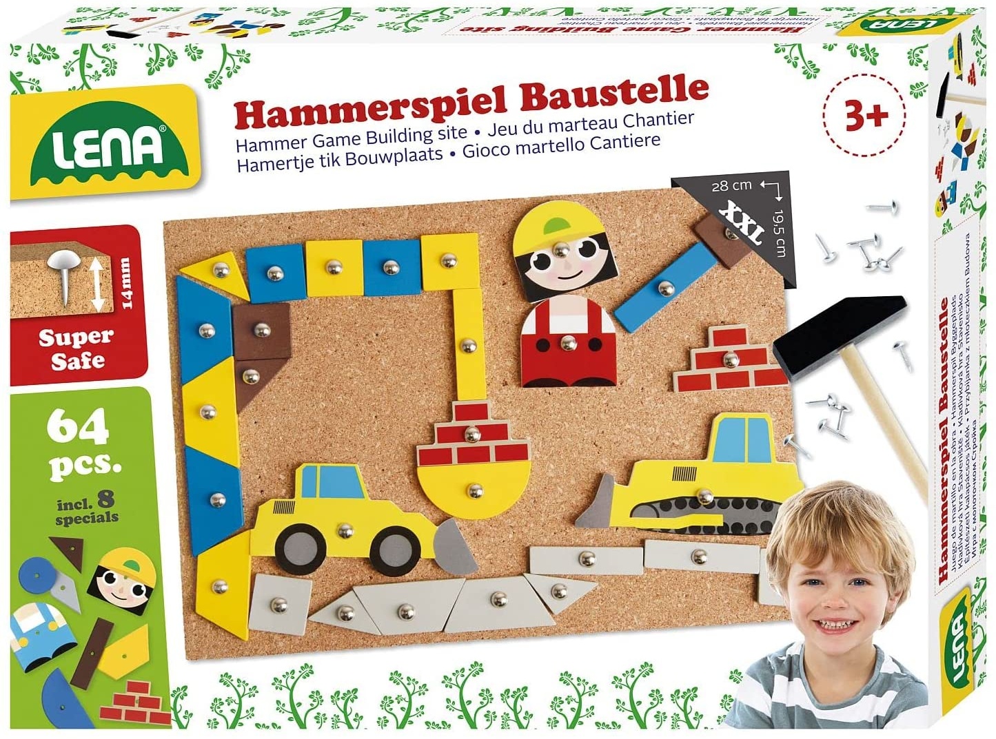 | Name | Lena 65828 Hammerspiel, Nagelspiel mit 64 bunten 8 Baustellen Teilen, Grundplatte aus Kork ca. 28 x 19,5 cm, Hammer und Nägel, Klopfspiel für Kinder ab 3 Jahre, Hämmerchenspiel, Mehrfarbig |