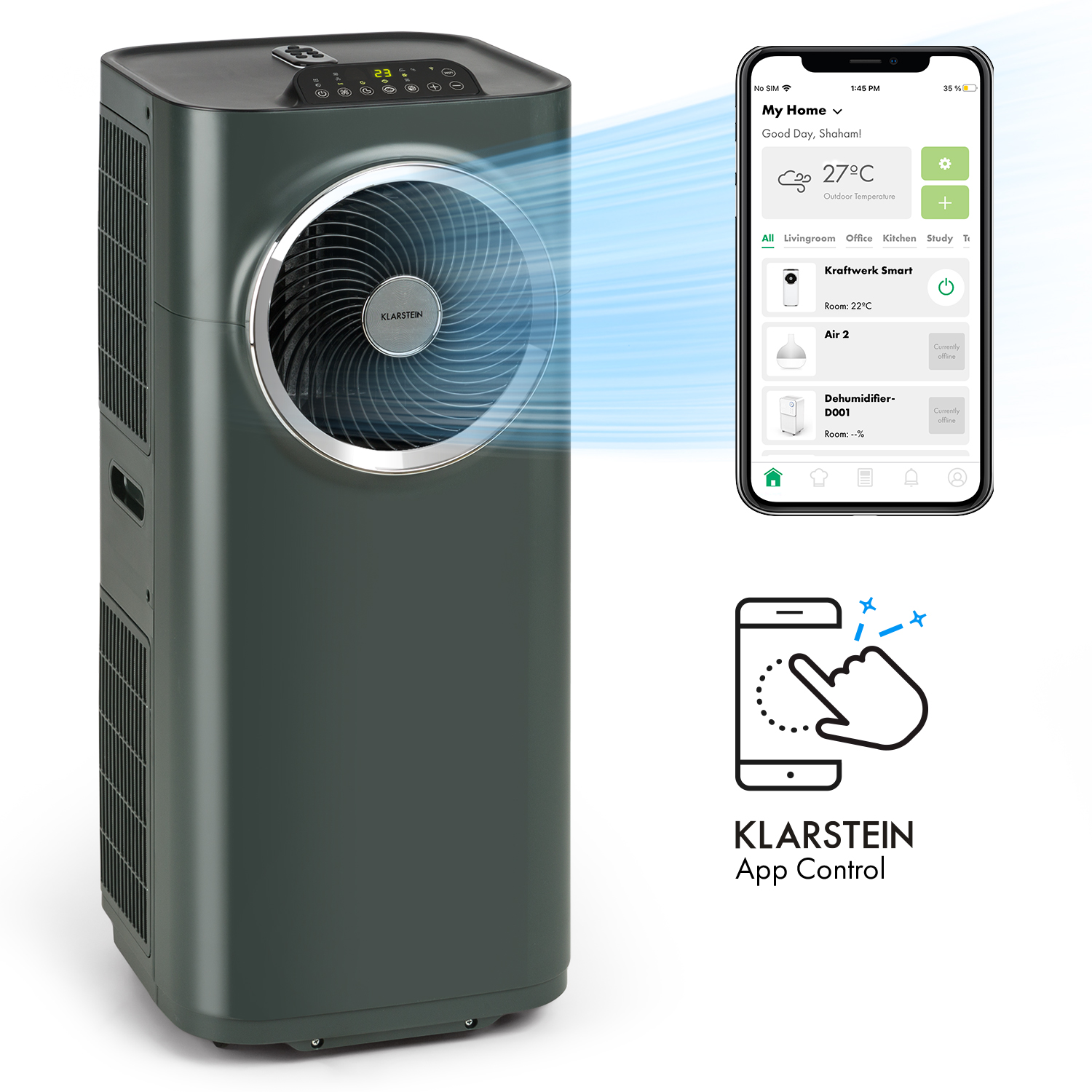 Die Klarstein Kraftwerk Smart 12K mobile Klimaanlage bietet eine effiziente Kühlleistung von 12.000 BTU, die besonders in größeren Räumen spürbar ist. Dank der einfachen Steuerung über die App lässt sich die Temperatur mühelos regulieren, was für ein angenehmes Raumklima sorgt. Die effektive Temperaturregelung ermöglicht es, auch an heißen Tagen einen kühlen Kopf zu bewahren.