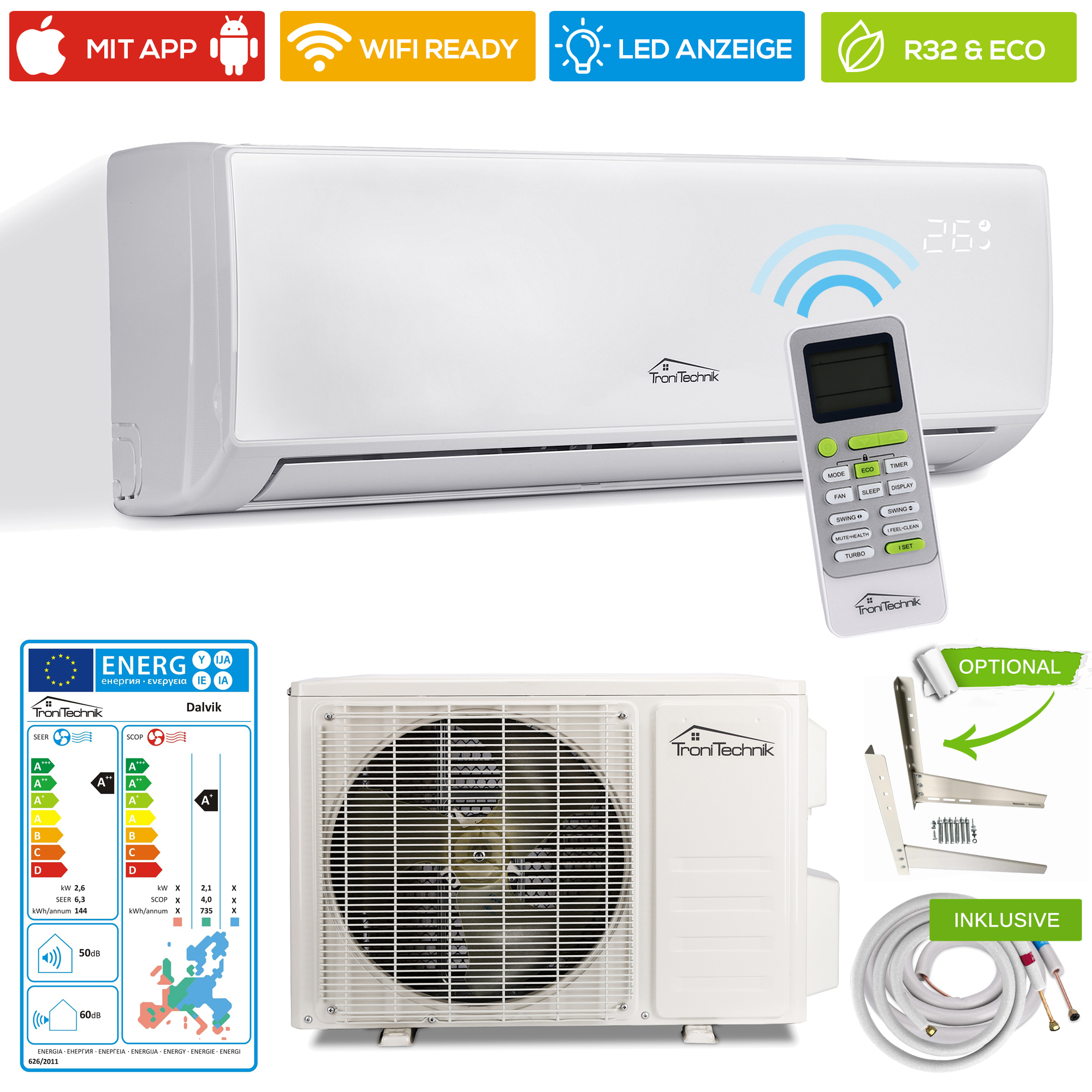 Das Tronitechnik Dalvik Split Klimagerät 9000 BTU bietet eine effiziente Kühl- und Heizleistung, die Ihnen in jeder Jahreszeit ein angenehmes Raumklima ermöglicht. Die Inneneinheit arbeitet leise, sodass Sie sich ungestört entspannen können. Mit der Möglichkeit zur Steuerung über eine App und Smart Home Integration haben Sie die volle Kontrolle über das Gerät und können es bequem von unterwegs aus bedienen.
