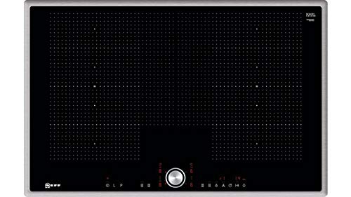 Das Neff Induktionskochfeld präsentiert sich in einem eleganten schwarzen Design mit einem flachen Rahmen in Silber, das sich nahtlos in jede moderne Küche integrieren lässt. Mit einer Breite von 82,6 cm und einer Höhe von 5,5 cm ist es für Standardküchen geeignet und bietet ausreichend Platz für mehrere Töpfe. Die Verarbeitung ist hochwertig, was sich in der Langlebigkeit und der einfachen Reinigung des Glaskeramik-Oberfläche zeigt. Kundenberichte loben das ästhetische Erscheinungsbild und die einfache Integration in verschiedene Kücheneinrichtungen.