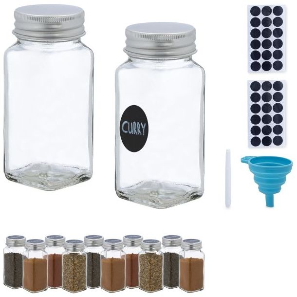 Mit dem Gewürzgläser 12er Set 10042291 bringen Sie Ordnung in Ihr Gewürzsortiment. Die eckigen Gläser aus Glas mit Aluminium- und Silikondeckel sind ideal zur Aufbewahrung von getrockneten Kräutern und Gewürzen. Der beiliegende faltbare Silikon-Trichter ermöglicht ein einfaches Befüllen, während die wählbaren Streuöffnungen für eine individuelle Würzung Ihrer Gerichte sorgen. Beschriften Sie die Gläser mit den mitgelieferten Etiketten und dem Stift für eine übersichtliche Organisation. **Highlights** - 12 Gewürzgläser mit Deckel für getrocknete Kräuter und Gewürze - Leichtes Befüllen dank platzsparend faltbarem Silikon-Trichter - Gerichte individuell würzen dank wählbar feiner und grober Streuöffnung - Inklusive Etiketten und weißem Stift zum übersichtlichen Beschriften - Zur ordentlichen Gewürzaufbewahrung in Regal, Schublade uvm. **Produkteigenschaften** - Maße je Streuer H x B x T: ca. 11 x 4,5 x 4,5 cm - Volumen je Streuer: ca. 120 ml - Gewicht: je ca. 130 g - Material: Glas, Aluminium, Silikon - Farbe: Transparent, Silber - Feine Streuöffnung D: ca. 3 mm - Grobe Streuöffnung B x T: ca. 1,4x1,2 cm - Durchmesser Etiketten: ca. 3,5 cm - Maße Trichter H x B x T: ca. 6,5 x 6 x 7 cm **Lieferumfang** - 12x Gewürzdose (leer) - 36x Etikett - 1x Stift - 1x Trichter - Dekoartikel sind im Lieferumfang nicht enthalten