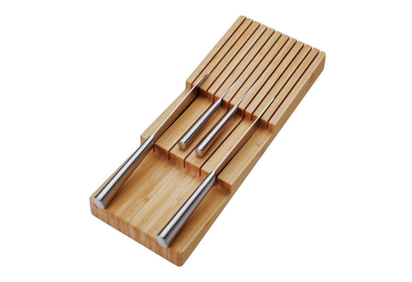 • Mit speziellen Schlitzen für verschiedene Messergrößen verbessert er die Organisation in der Schublade und erleichtert den Zugriff auf die Messer