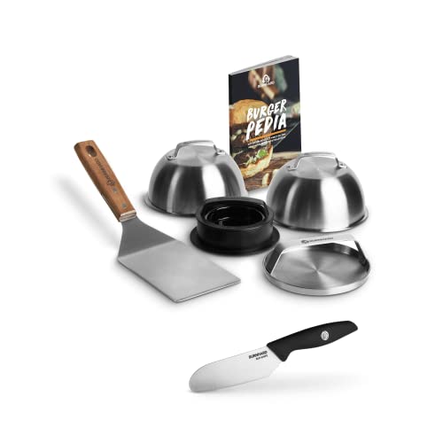 BURNHARD Burger-Set 7-TLG. inkl. Burger Bun Messer - BurgerpresseWender, Smasher, 2 Melting Domes aus Edelstahl und Rezeptheft