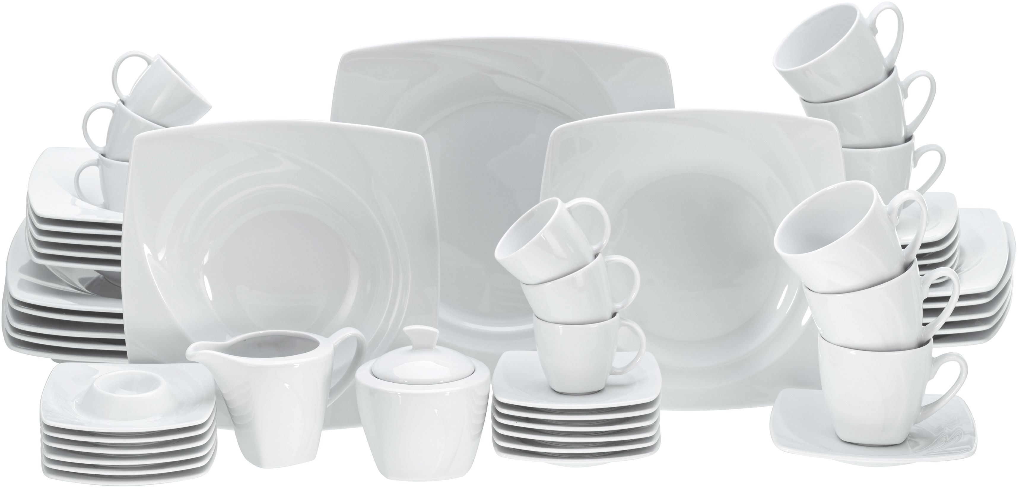 Das CreaTable 13136 Kombiservice Celebration ist ein elegantes und klassisches Porzellanset für den täglichen Gebrauch. Das Set besteht aus hochwertigem Qualitätsporzellan, das in Europa hergestellt wurde. Mit seinem schönen Komplettset aus einer großen Serie ist es für bis zu 6 Personen geeignet. Das Geschirr ist spülmaschinenfest und mikrowellengeeignet. Die abgerundete, quadratische Form mit tropfenförmigen Spiegel verleiht dem Set eine besondere Note. **Highlights** - Hochwertiges Qualitätsporzellan - Geeignet für bis zu 6 Personen - Spülmaschinenfest und mikrowellengeeignet - Abgerundete, quadratische Form mit tropfenförmigen Spiegel - Made in Europe **Produkteigenschaften** - Serie: Celebration weiß - Kombiservice 50-tlg. - Material: Porzellan - Farbe: Weiß - Form: Quadrat - Abmessungen: - Teller flach: 27 cm - Teller tief: 23 cm - Teller flach: 21 cm - Obertassen: 20 cl - Untertassen: 15 cm - Espressotassen: 10 cl - Espressountertassen: 14 cm - Eierbecher mit Ablage - Zuckerdose - Milchgießer **Lieferumfang** - 6 Teller flach 27 cm - 6 Teller tief 23 cm - 6 Teller flach 21 cm - 6 Obertassen 20 cl - 6 Untertassen 15 cm - 6 Espressotassen 10 cl - 6 Espressountertassen 14 cm - 6 Eierbecher mit Ablage - 1 Zuckerdose - 1 Milchgießer