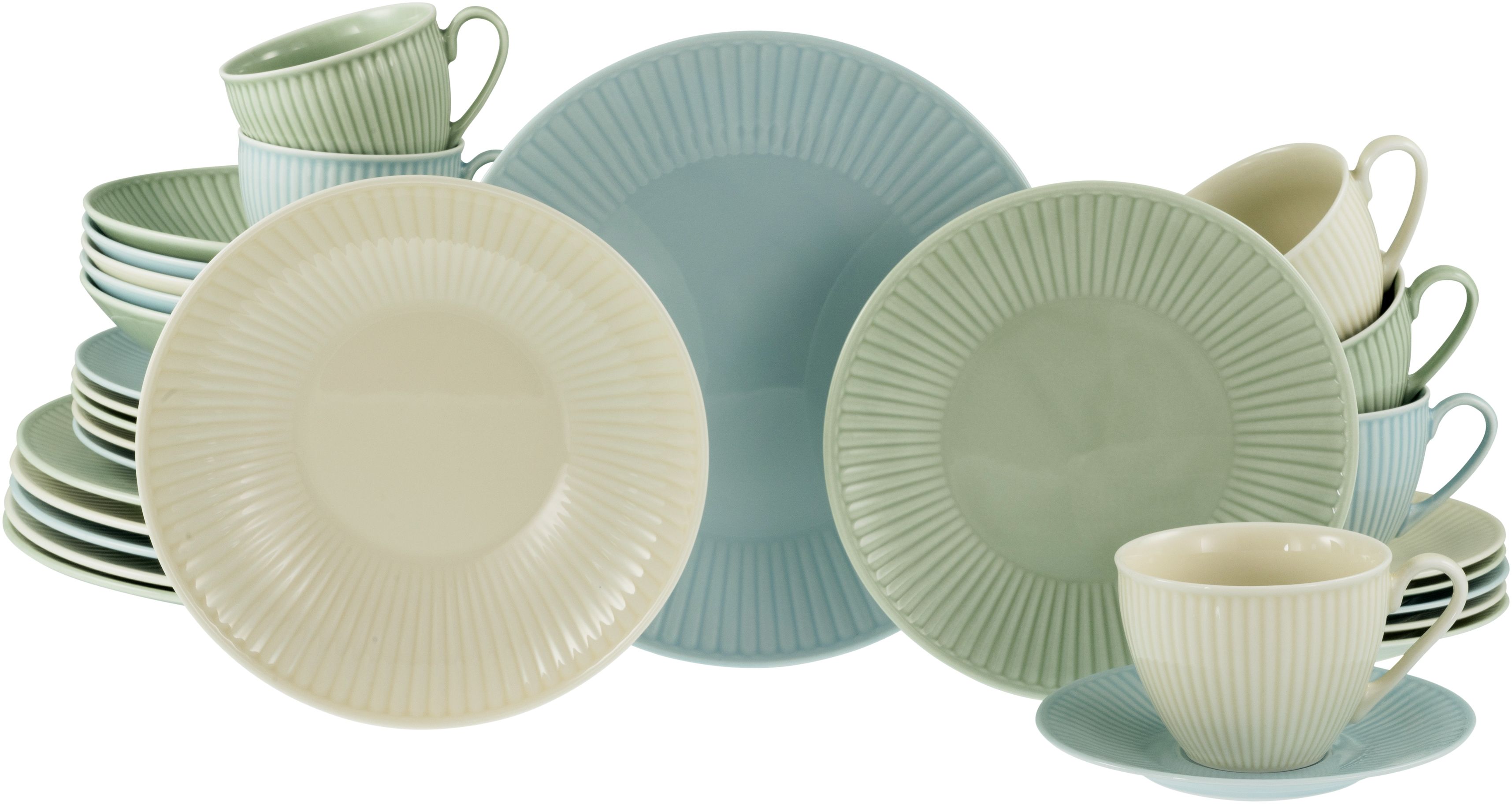| Lieferumfang | 6x Speiseteller, 6x Suppenteller, 6x Dessertteller, 6x Kaffeetasse, 6x Untertasse |
