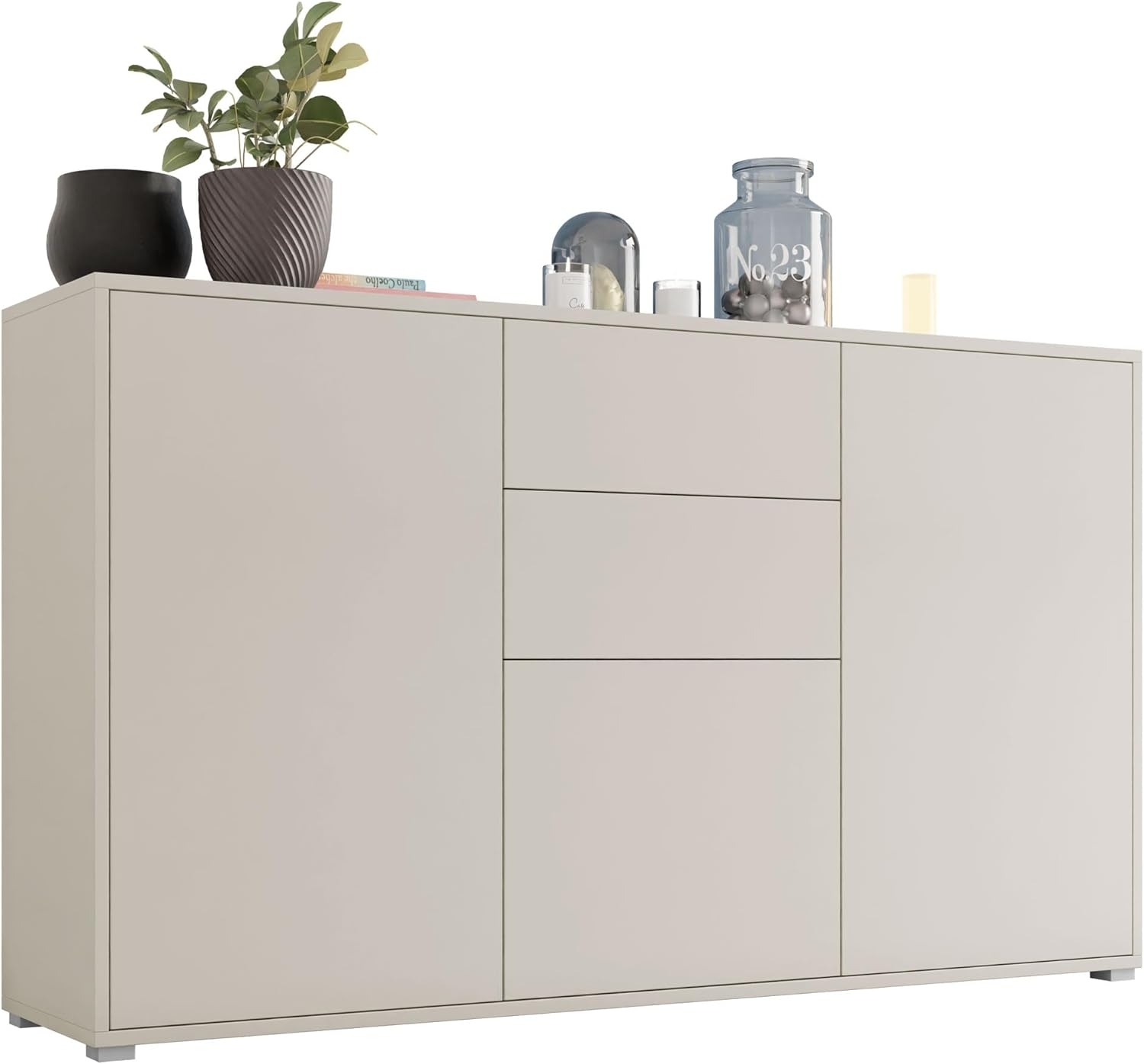 Die Kommode Gesita K3D2SZ in der eleganten Farbe Cashmere vereint stilvolles Design mit praktischer Funktionalität. Mit einer Länge von 141 cm, einer Höhe von 93 cm und einer Breite von 41 cm bietet sie ausreichend Stauraum. Die hochwertige Ausführung aus 16 mm Spanplatte und das griffloses Öffnungssystem "Push to Open" sorgen für eine moderne Optik und einfache Handhabung. **Highlights** - Griffloses Öffnungssystem "Push to Open" für eine elegante Bedienung - Hochwertige Verarbeitung aus 16 mm Spanplatte - 3 Türen und 2 Schubladen für optimalen Stauraum - Füße aus Kunststoff für Stabilität - Lieferung mit Montageanleitung zum Selbstaufbau **Produkteigenschaften** - Maße (LxHxB): 141 x 93 x 41 cm - Rand aus PCV - Gleitschienen für sanftes Öffnen und Schließen - Alle Maße sind ca. Maße **Lieferumfang** - Kommode Gesita K3D2SZ - Montageanleitung - Lieferung bis zur ersten Tür (kein Montageservice) - Ohne Dekoration