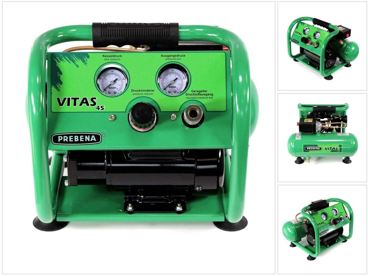 Der Prebena Kolbenkompressor VITAS 45 ölfrei bietet seinen Nutzern eine Vielzahl von Vorteilen. Er ist handlich, kompakt und leicht zu tragen, was ihn ideal für den mobilen Einsatz und kleinere Handwerkerarbeiten macht. Die stabile Bauweise mit geschützten Leitungen sorgt für Langlebigkeit und Zuverlässigkeit. Dank der Gummifüße steht er stabil auf dem Untergrund und dämpft Vibrationen. Die einfache Bedienung ermöglicht es dem Benutzer, den Druck mühelos zu regulieren. Zudem überzeugt der Kompressor durch seine leise Betriebslautstärke im Vergleich zur herkömmlichen Druckluftpistole.