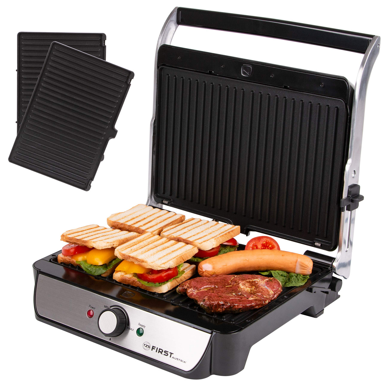 Der TZS First Austria XXL elektrische Kontaktgrill bietet eine große Grillfläche und ist vielseitig einsetzbar, eignet sich jedoch aufgrund seiner schwachen Wärmeleistung und fehlenden Bedienelemente nur bedingt zum Grillen. Die herausnehmbaren Platten erleichtern die Reinigung, während das Design ansprechend ist. Einige Nutzer berichten von Problemen mit der Halterung und der Temperaturregelung.