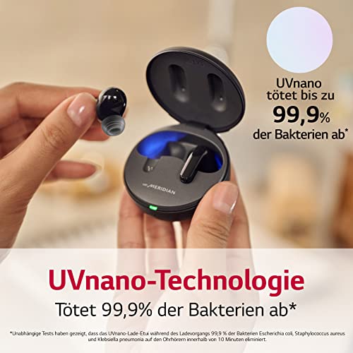 Die LG TONE Free DT60Q In-Ear Bluetooth Kopfhörer mit MERIDIAN-Technologie bieten ein schickes und elegantes Design, das an die beliebten Apple AirPods Pro erinnert. Mit einem starken Bass und der Möglichkeit, den Klang über die LG-App anzupassen, sorgen sie für ein erstklassiges Hörerlebnis. Zudem verfügen sie über UV-Licht zur Reinigung der Gummiaufsätze sowie eine gute aktive Geräuschunterdrückung (ANC) und Akkulaufzeit.
