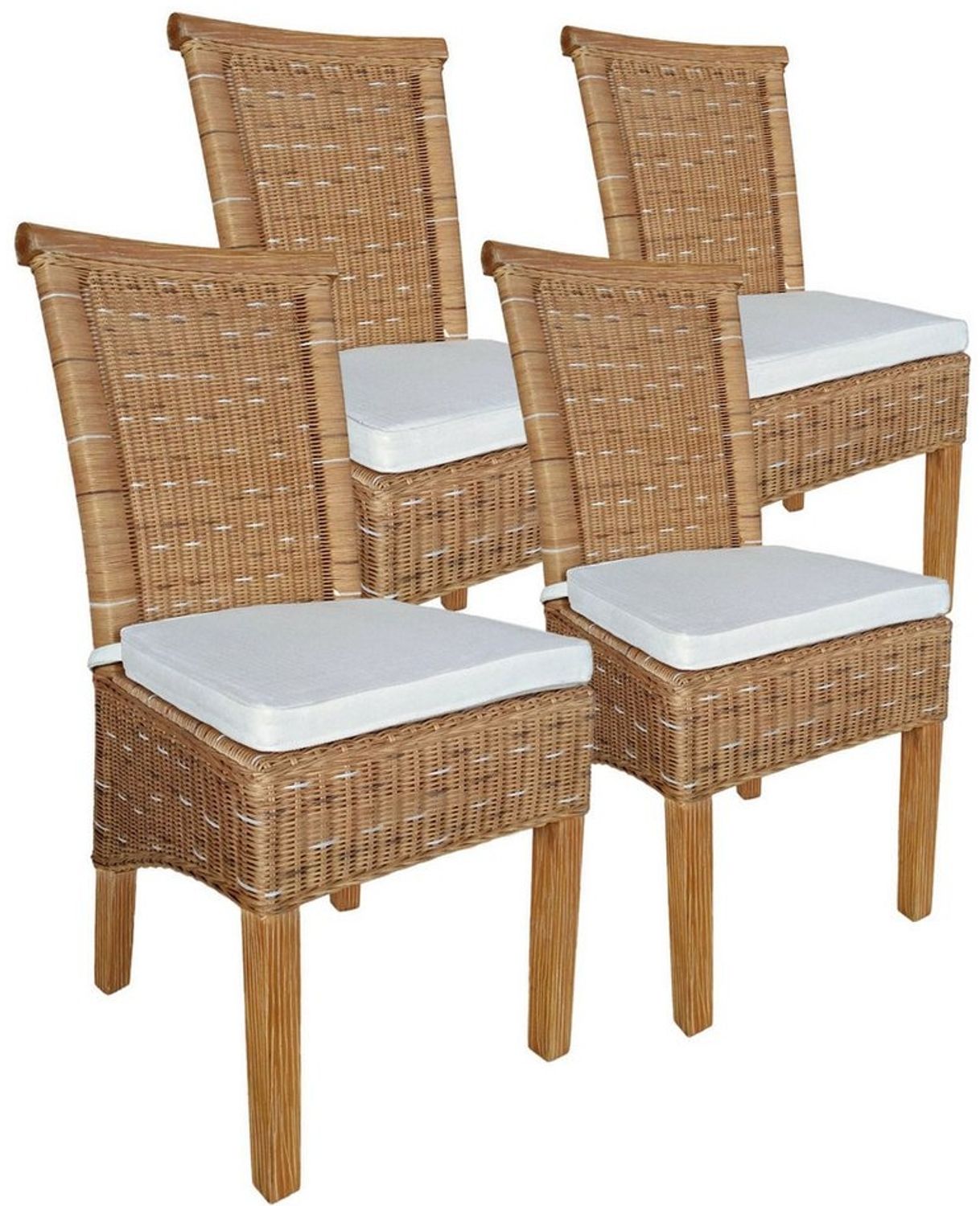 **Maße:** Breite: 47 cm, Höhe: 97 cm, Tiefe: 54 cm, Sitzhöhe ohne Kissen ca. 46 cm, mit Kissen ca. 50 cm ************Material:** Geflecht **Naturrattan** capuccino, Beine und Griffleiste **Pinie massiv************ * Rattanstuhl capuccino von Hand hochwertig verarbeitet mit Griffleiste im Set zu 4 Stück für Esszimmer oder Wintergarten in braun * Stuhl mit robuster Bauweise und hoher Stabilität und Festigkeit - **jeder Stuhl ist ein Unikat (keine Maschinenfertigung!)** * Esszimmer-Stuhl mit hoher Strapazierfähigkeit und sehr guten Gebrauchseigenschaften mit natürlicher nicht glatter Oberfläche (Tragkraft ca. 200 kg) * Rattan-Stühle aus 100 % FSC-zertifiziertem Naturrattan für 100 % natürliches Wohnen * Sitzkissen mit Schleife in Schaumstoffstärke 3 cm, Bezug mit Reißverschluß hinten Leinen weiß abieh- und handwaschbar Die Rattanstühle Perth sind hochwertig verarbeitete Stühle für Esszimmer oder Wintergarten aus Naturrattan. Ihr besonders gutes Preis-Leistungs-Verhältnis und die hochwertige, robuste Bauweise zeichnen diese Stühle aus. Durch die schön straff geflochtenen Rattanruten wird hohe Stabilität und Festigkeit erzeugt. Alle Rundungen und Übergänge sind formschön und mit Liebe zum Detail verarbeitet. Die Esszimmerstühle haben am Lehnenkopf eine Griffleiste zum besseren Bewegen. Die Stühle sind mit Kunststofffußgleitern ausgestattet, so dass Parkett und Fußböden beim Schieben nicht beschädigt werden. Passend zu den Stühlen erhalten Sie die Sitzkissen in der Farbe Leinen weiß. Die Sitzkissen kann man abziehen und von Hand waschen. Die Bezüge der Sitzkissen nach der Wäsche in halbfeuchtem Zustand wieder beziehen, damit Sie ihre Form behalten. Durch die hochwertige Verarbeitung werden diese Rattanstühle über viele Jahre hinweg Ihre Räumlichkeiten verschönern. **Achtung! Diese Stühle werden von Hand produziert und sind nie ganz gleich. Jedes Stück ist ein Unikat!**