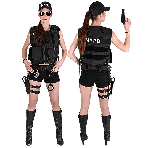 Black Snake® Damen Kostüm SWAT POLICE FBI SECURITY | EinsatzwesteGürtel, Beinholster, Cap, Handschellen (NYPD, XS/S)