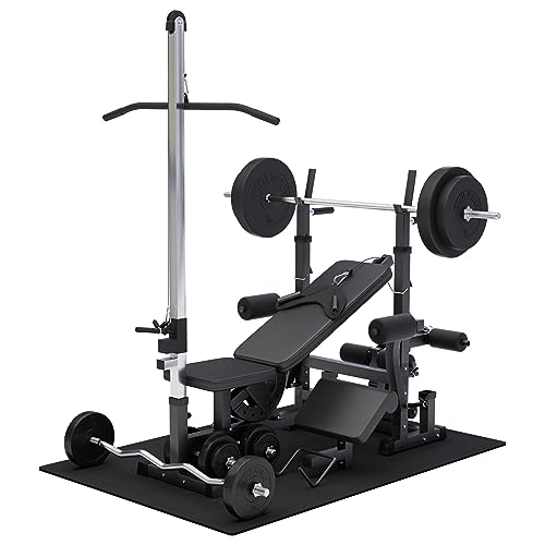 • Enthalten sind eine Hantelbank, Curlbank, Butterfly-Arme, Seilzug-Modul, verstellbare Langhantelablage, Latzugturm und verstellbare Rückenlehne