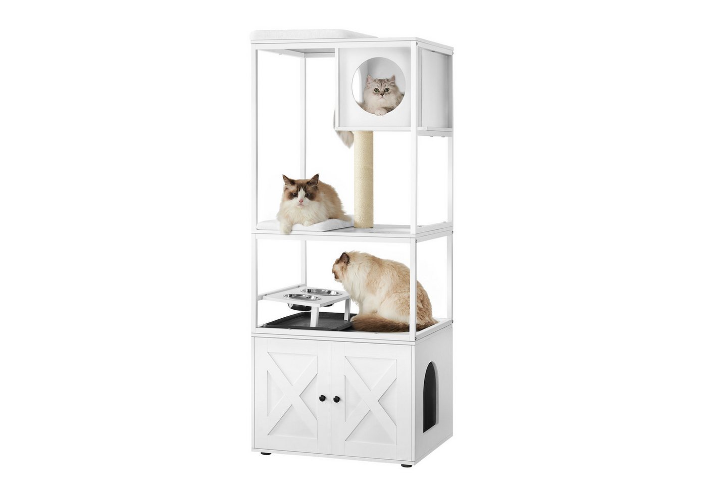 FEANDREA Kratzbaum3-in-1, mit Katzenklo-Schrank, erhöhter Napfständer, Vintagebraun/nebelgrau/wolkenweiß