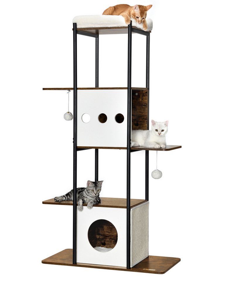 • Zwei Katzenhöhlen und eine gemütliche obere Plattform mit flauschigen Kissen laden zum Ausruhen ein