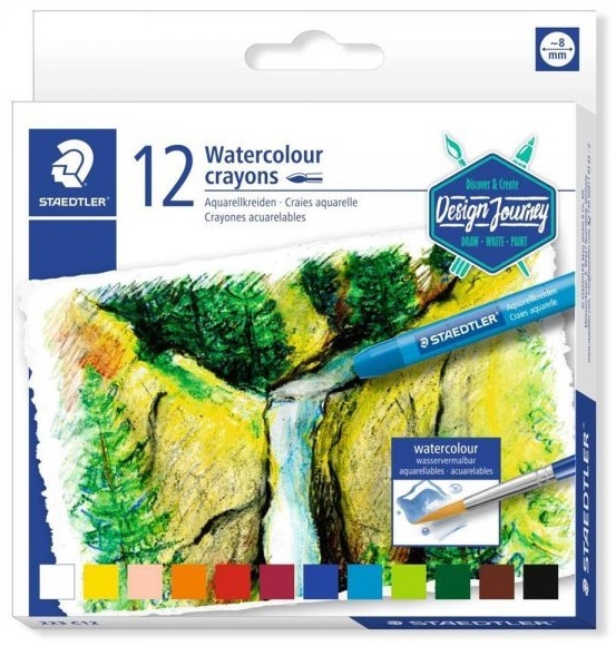 STAEDTLER Aquarellkreide Design Journey, 12er Kartonetui wasservermalbar, leicht verwischbar, Kreidedurchmesser: 8 mm, rund, mit Papierbanderole, gut geeignet für Schichttechnik & Sgraffito, beinhaltet: 12 Kreiden (223 C12)sortiert in den Farben weiß, gelb, hautfarben, orange,rot, bordeauxrot, kobaltblau, hellblau, blattgrün, grün,van-Dyke-braun, schwarz Aquarellkreide Design Journey, Kartonetui • wasservermalbar • Kreidedurchmesser: 8 mm • hochopque Farben, leicht verwischbar • mit Pinsel und Waser für eine Vielzahl von Aqurelleffekten • mit Papierbanderole für saubere Hände 12er Etui: sortiert in den Farben weiß, gelb, hautfarben, orange, rot, bordeauxrot, kobaltblau, hellblau, blattgrün, grün, van-Dyke-braun, schwarz 24er Etui: sortiert in den Farben violett, dunkellila, rosenholz, hellmagenta, ocker, sand, grau, sienna gebrannt, hellgrün, hellolivgrün, seegrün, cyan + Farben 12er Etui Anwendung - gut geeignet für Schichttechnik und Sgraffito