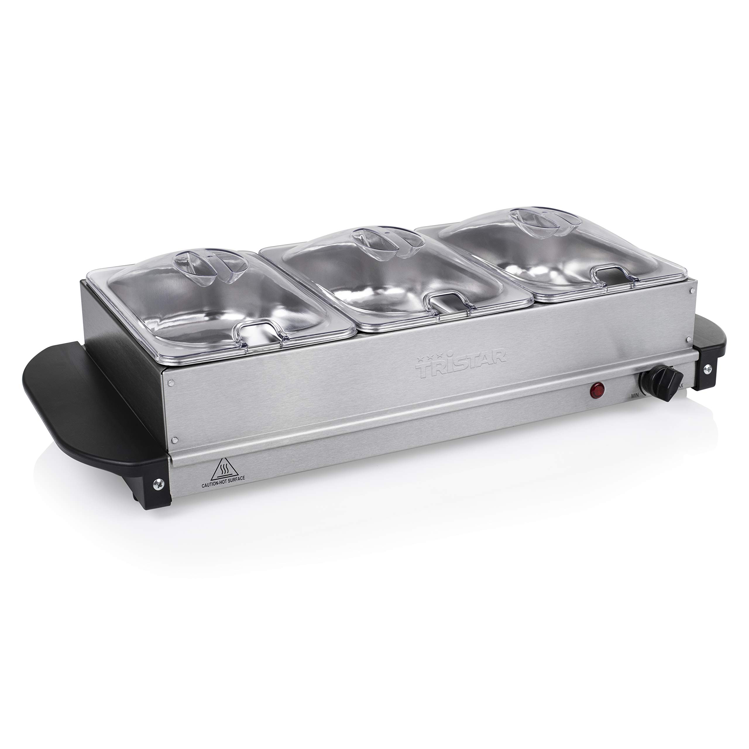 Der Tristar Edelstahl Buffetwärmer mit einstellbarem Thermostat bietet die Möglichkeit, Speisen über einen längeren Zeitraum warm zu halten. Mit seiner guten Heizleistung und der robusten Edelstahlhalterung sorgt er dafür, dass Ihr Essen stets die richtige Temperatur behält. Das Gerät eignet sich ideal für Brunch oder Grillabende, bei denen Sie verschiedene Gerichte warm servieren möchten.