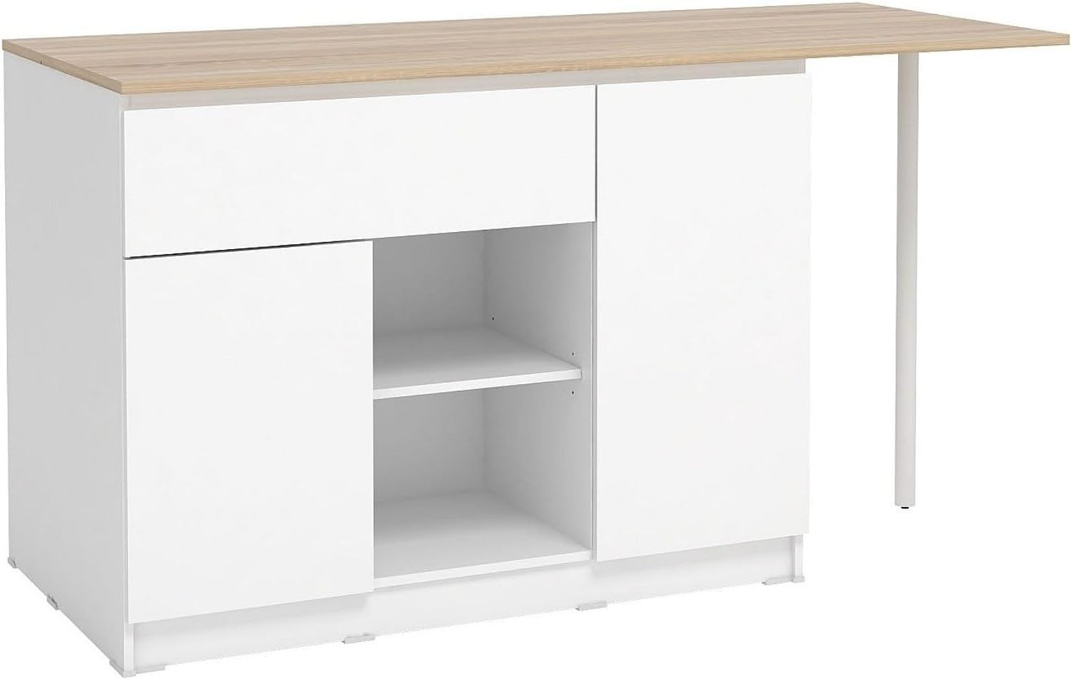 Die Kücheninsel TUNORI vereint modernes Design mit praktischen Funktionen. Sie bietet zwei Türen, eine Schublade und zwei Regalfächer, die ausreichend Stauraum für Ihre Küchenutensilien schaffen. Die Kombination aus Weiß und hellen Holzfarben sorgt für eine harmonische Ergänzung Ihrer Einrichtung. **Highlights** - 2 Türen für zusätzlichen Stauraum - 1 Schublade für eine einfache Organisation - 2 Regalfächer für optimale Raumnutzung - Unsichtbarer Griff für ein modernes Design - Maximale Traglast von 35 kg **Produkteigenschaften** - Farbe: Weiß, Naturfarben hell - Material: Holzspan - Material (Füße): Metall - Maße (HxBxT): 90,5 x 169,8 x 70 cm - Schublade: L78 x B40 x H15,4 cm - Rechte Tür: L39,6 x B42,8 x H77,6 cm - Linke Tür: L39,6 x B42,8 x H55,2 cm - Obere Ablage: L39,2 x B39 x H26 cm - Untere Ablage: L39,2 x B42,8 x H27,5 cm - Maximale Traglast der Schublade: 10 kg - Maximale Traglast der Regalfächer (innen und außen): 5 kg - Produkt zum Selbstaufbau **Lieferumfang** - Kücheninsel TUNORI - Montageanleitung - Paket Nr.1: Breite 125 cm, Tiefe 64 cm, Höhe 17 cm, Gewicht 37 kg - Paket Nr.2: Breite 183 cm, Tiefe 82 cm, Höhe 10 cm, Gewicht 32 kg - Ohne Elektrogeräte