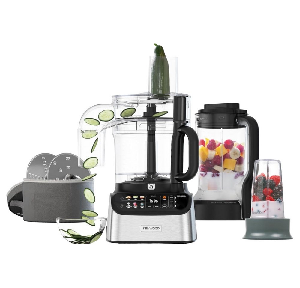| Lieferumfang | 3 Liter Schüssel, 1.5 Liter Mixeraufsatz, Express Serve™, Smoothie-Aufsatz, gezahntes Edelstahlmesser, Teighaken, 4 mm wendbare Schneid-/Raspelscheibe, 2 mm wendbare Schneid-/Raspelscheibe, Doppelschneebesen, Zitruspresse, SmartStore™ Aufbewahrung, Abwiegeschale, Spatel |
