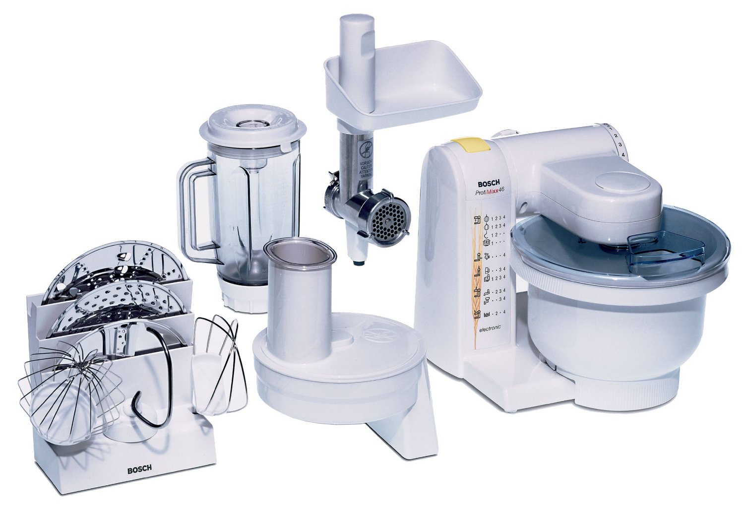 Testsieger und kleinstes Modell aus der MUM-Serie von Bosch. Kunststoffgehäuse. Ein Klassiker, geeignet für kleine bis mittlere Portionen. Fleischwolf und Mixtulpe werden mitgeliefert. Beim Mixen sehr laut.