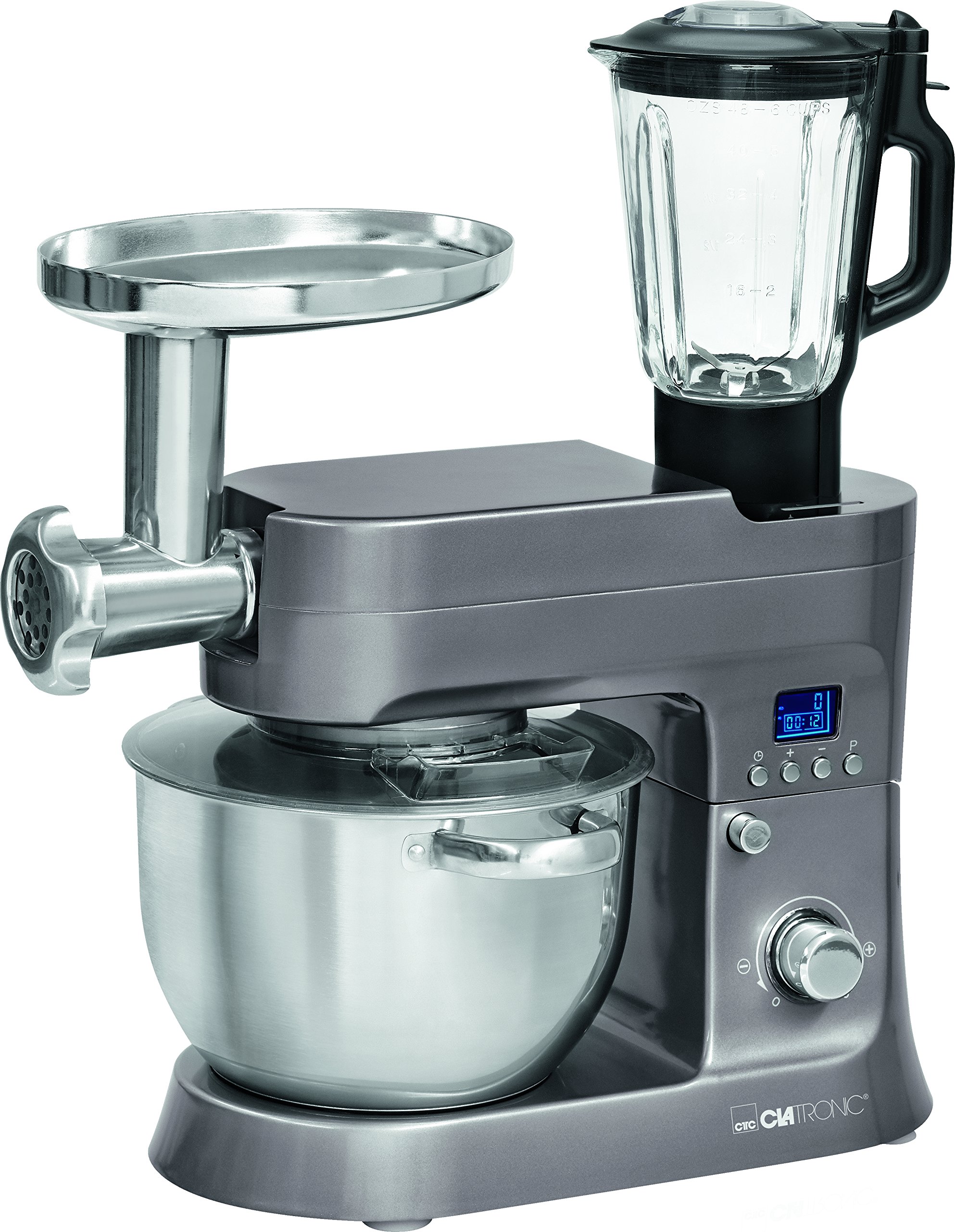 | Lieferumfang | Edelstahlschüssel (6,2 Liter), Glas-Mixbehälter (1,5 Liter), Alu-Druckguss-Rührhaken, Alu-Druckguss-Knethaken, Schneebesen aus Edelstahl, Fleischwolf mit Edelstahlmesser, Metallhals, Metallschnecke, 3 Edelstahl-Lochscheiben, Metallnachfülltablett, Plätzchenaufsatz, Wurstfülleraufsatz, Kebbe-Aufsatz, 3 verschiedene Aufsätze für Pasta (Spaghetti, Makkaroni, Tagliatelle), transparenter Spritzschutzdeckel. |