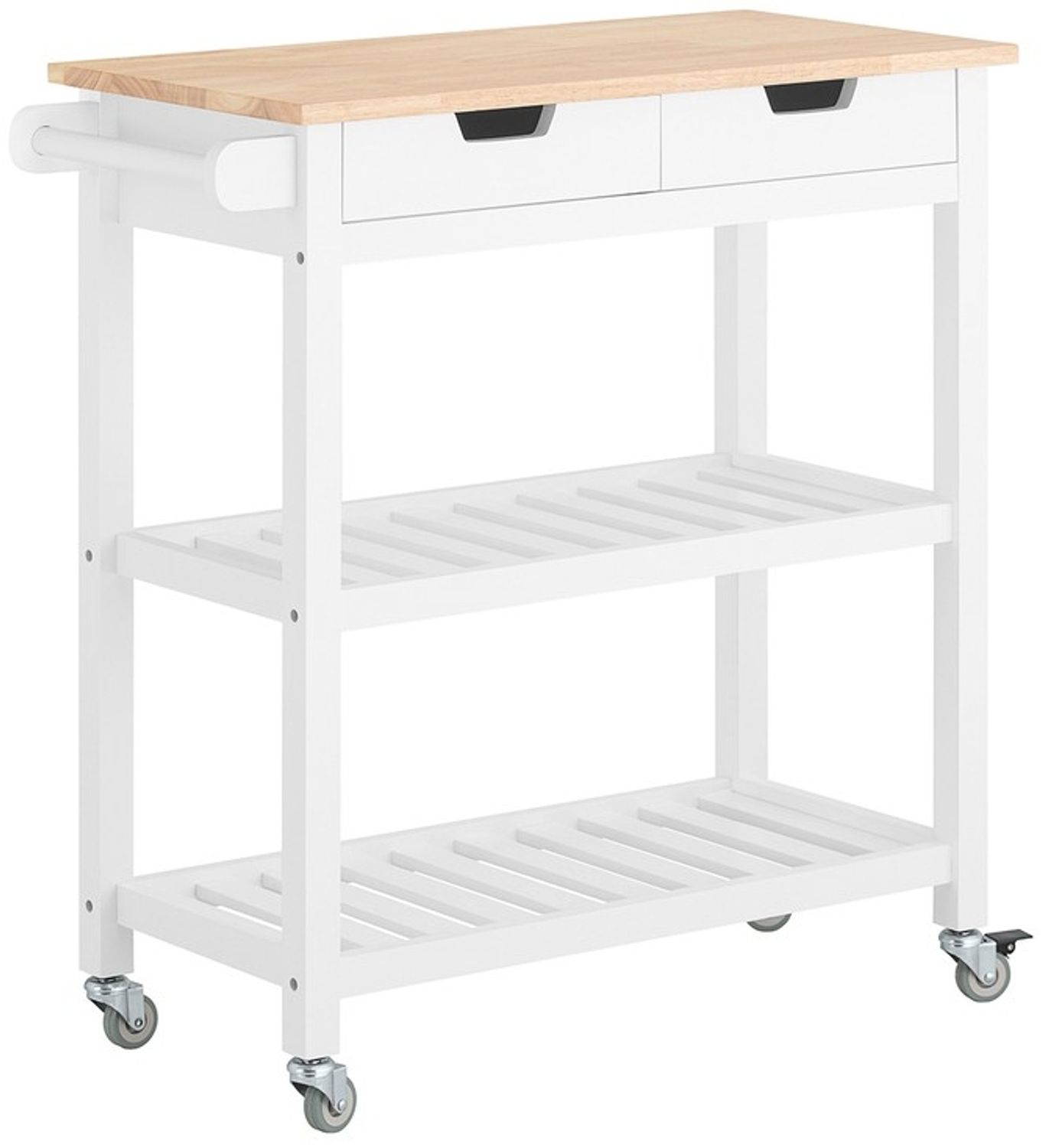 Der Küchenwagen FKW68-WN in Weiß bietet mit seinen zwei Schubladen und zwei Ablagen viel Stauraum für Ihre Küchenutensilien. Die Tischplatte aus Kautschukholz und das Gestell aus Kiefer/MDF garantieren Stabilität und Langlebigkeit. Mit einem Gewicht von ca. 17,4 kg und einer Belastbarkeit von bis zu 50 kg ist er vielseitig einsetzbar. Der seitliche Handtuchhalter und die vier stabilen Gummirollen (zwei feststellbar) machen ihn zu einem praktischen Helfer in jeder Küche. **Highlights** - Tischplatte aus Kautschukholz für eine robuste Arbeitsfläche - Zwei große offene Ablagefächer für ausreichend Stauraum - Seitlicher Handtuchhalter für Geschirrtücher - Vier stabile Gummirollen für einfache Mobilität - Vielseitig einsetzbar als Servierwagen oder Küchenhelfer **Produkteigenschaften** - Material: Tischplatte aus Kautschukholz, Gestell: Kiefer/MDF, weiß lackiert - Produktmaße: BHT ca. 85 x 90 x 39 cm - Paketmaße: 89 x 46 x 22 cm - Gewicht: ca. 17,4 kg - Belastbarkeit: bis 50 kg **Lieferumfang** - 1 x Küchenwagen - 1 x Anleitung - 1 x Zubehörbeutel