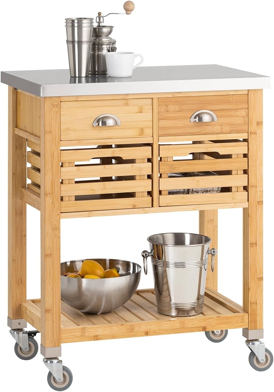 Der Servierwagen FKW40-N ist ein praktischer Küchenwagen aus Bambus und MDF mit einer eleganten Edelstahlplatte. Mit den Abmessungen von ca. 73 x 93 x 46 cm und einem Gewicht von ca. 28 kg ist er belastbar bis zu 50 kg. Ausgestattet mit 2 Schubladen und 2 Körben sowie 4 leichtgängigen Rollen, von denen 2 feststellbar sind, bietet er Flexibilität und Stauraum für Ihre Küche. **Highlights** - Edelstahlplatte ohne Fingerabdrücke - Leicht zu verschieben dank 4 Rollen (2 davon feststellbar) - 2 Schubladen und 2 Körbe - Ideal zum Servieren von Speisen oder als Arbeitsfläche **Produkteigenschaften** - Material: Bambus mit MDF, lackiert - Edelstahlplatte - Gewicht: ca. 28 kg - Belastbarkeit: 50 kg - Maße: 73 x 93 x 46 cm **Lieferumfang** - 1 x Küchenwagen - 1 x Anleitung - 1 x Zubehörbeutel