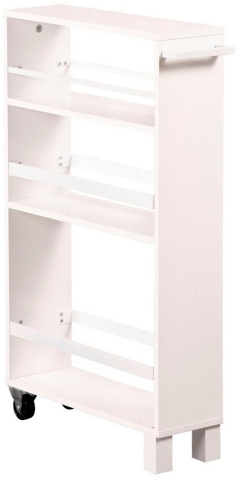 Das Nischenregal / Küchenregal mit drei Ablageebenen ist ein praktisches Möbelstück für Ihre Küche. Es besteht aus weißer Spanplatte und verfügt über einen Griff zum einfachen Herausziehen. Mit zwei Rollen und zwei festen Füßen ist es leicht zu bewegen und stabil. Die Ablageebenen haben hohe Ränder, um Gewürze, Flaschen und andere Gegenstände sicher aufzubewahren. Das Regal hat eine Breite von 15 cm, eine Tiefe von 50 cm und eine Höhe von 79 cm. **Highlights** - Praktischer Griff zum einfachen Herausziehen - Zwei Rollen und zwei feste Füße für einfache Bewegung und Stabilität - Drei Ablageebenen mit hohen Rändern für sichere Aufbewahrung von Gewürzen, Flaschen usw. **Produkteigenschaften** - Material: Spanplatte - Farbe: Weiß - Abmessungen: Breite: 15 cm, Tiefe: 50 cm, Höhe: 79 cm **Lieferumfang** - 1x Nischenregal / Küchenregal - 3 Ablageebenen - Weiß (zerlegt geliefert, einfache Montage erforderlich) - Dekorationsartikel, Beleuchtungen, Hi-Fi-Geräte oder ähnliches sind nicht im Lieferumfang enthalten.