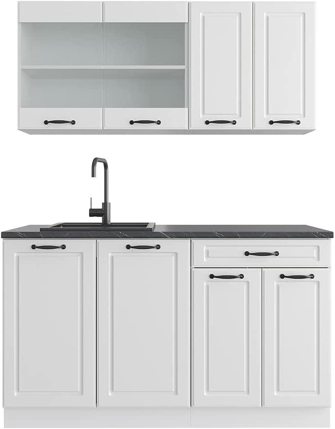 - Die verarbeiteten Materialen sind qualitativ sehr hochwertig und bieten höchsten Komfort in Nutzung und Pflege. - Unsere Küche ist variabel aufstellbar und bietet damit sehr viel Spielraum zur Gestaltung. - Im Block ist sie 140 cm breit und benötigt daher nur wenig Stellfläche. Die Hängeschränke können bei dieser Küche individuell angebracht werden. Sie sind 31 cm und die Unterschränke sind 46 cm tief. - Im Lieferumfang enthalten sind 4 einzelne Küchenschränke, eine bebilderte und leicht verständliche Montageanleitung sowie die dazugehörigen Montagematerialien. - Die Küche verschafft viel Stauraum durch die geräumigen Schränke und ist noch beliebig erweiterbar mit anderen Modulen der Serie R-Line. **Produktdetails:** **Farbe** - Korpus: Weiß, matt - Fronten: Weiß, matt - Griffe, Füße: Schwarz - Blenden: Weiß, matt **Maße** - Gesamt: 140 x 207 x 60 cm (BxHxT) - Füße: 9,5 - 13 cm (H) - Arbeitsfläche: 81 - 86 cm (H) **Gewicht** - Gesamt: 78,2 kg **Material** - Korpus: Spanplatte, 16 mm, furniert - Griffe, Füße: Kunststoff **Ausstattung** \- 1x Spülenunterschrank 80 cm \- 1x Schubunterschrank 60 cm \- 1x Hängeschrank 60 cm \- 1x Hängeglasschrank 80 cm